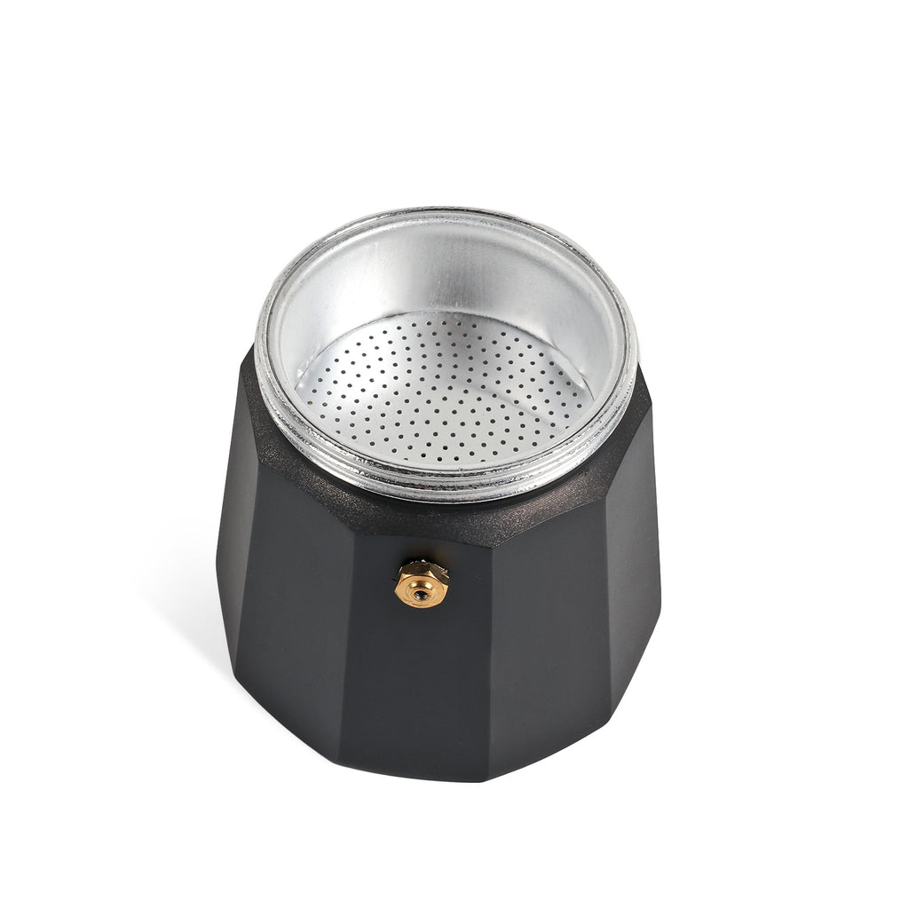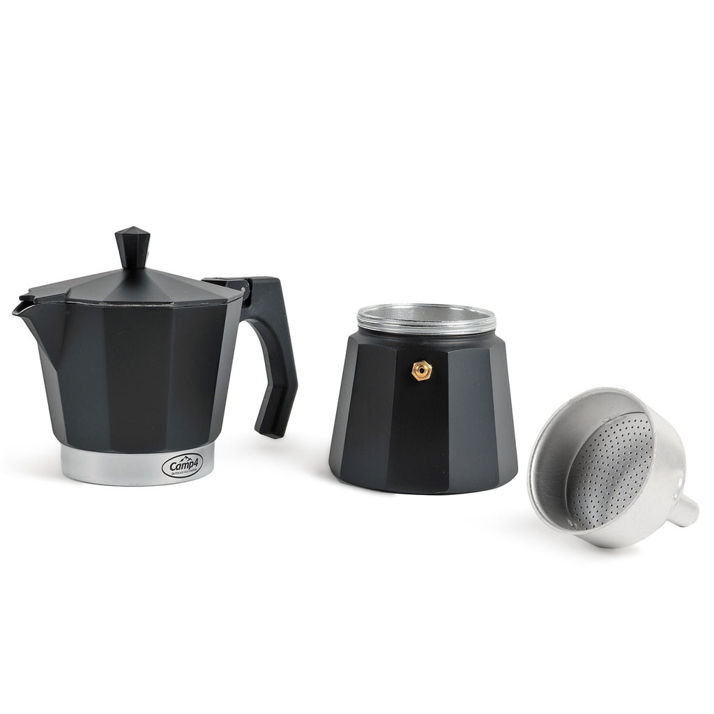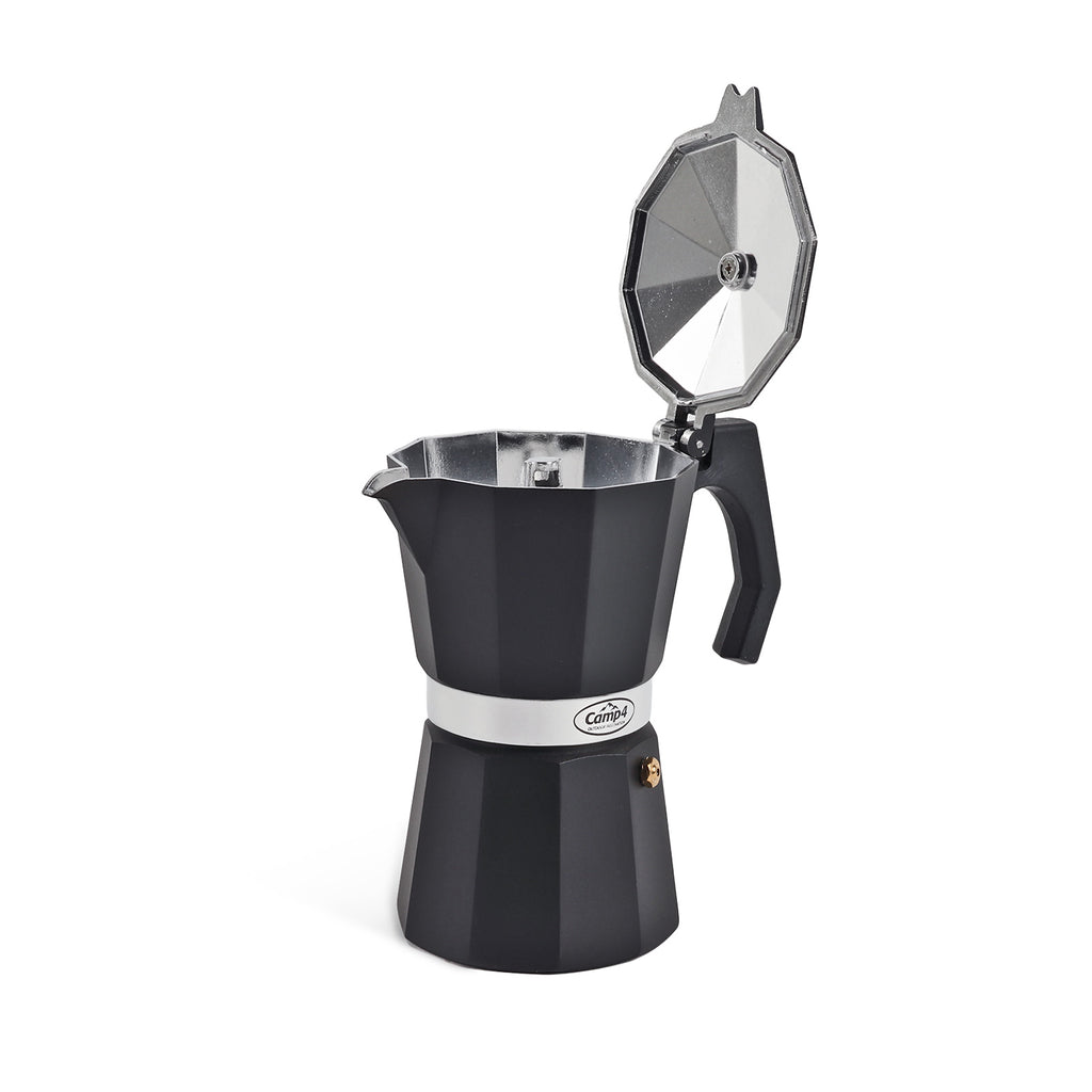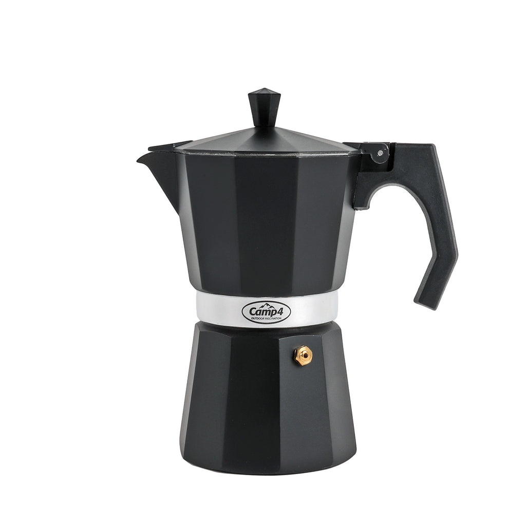 Der besondere Kaffeegenuss für unterwegs, fix zubereitet, schmeckt überall nach Urlaub. Der Espressokocher "NERO" aus Aluminium, für 6 Tassen. In edlem matt schwarz für ca. 300ml Espresso.