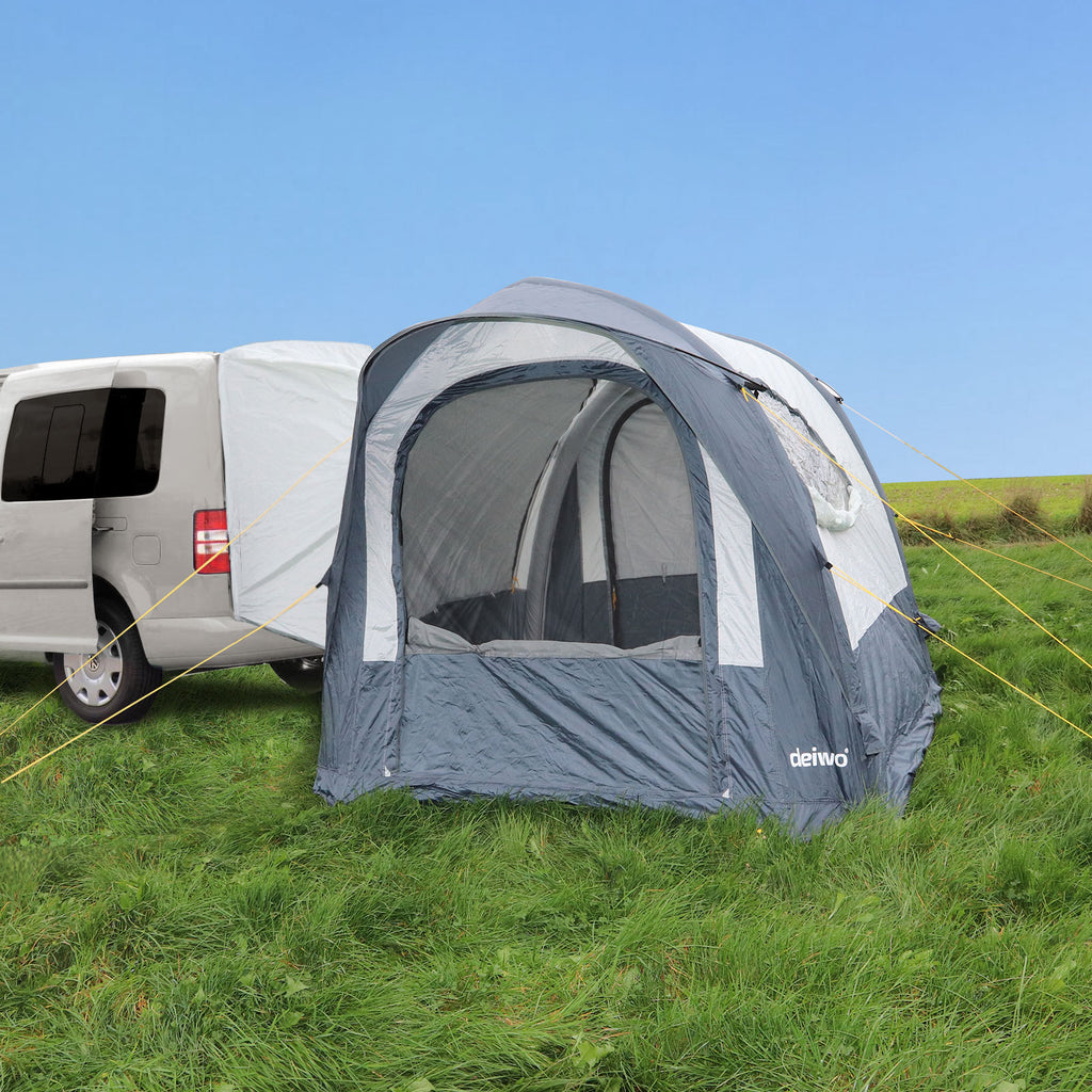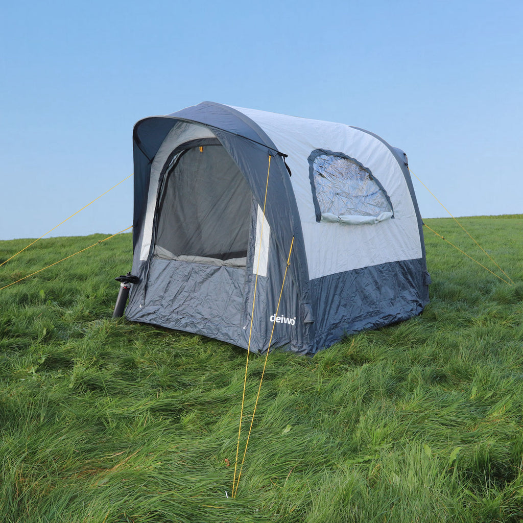 Freistehendes und aufblasbares Autozelt für fast alle Kombis, SUVs oder Mini-Vans, wie der Citroen Berlingo, Peugeot Kangoo oder VW Cargo. Dank der drei Luftkanäle ist das Zelt schnell und einfach auf- und abgebaut. Das Heckzelt kann leicht vom Auto getrennt werden, ohne das Zelt abzubauen. So kann die Umgebung mit dem Auto erkundet werden, während das Zelt an Ort und Stelle bleibt. Der Wohnraum ist passend für bis zu 4 Personen und eignet sich zum Schlafen, Essen und Entspannen sowie als Abstellfläche, direkt am Fahrzeug. Die große Öffnung zum Auto sowie die beiden Türen an den Seiten sind mit Moskitonetzen ausgestattet, die eine optimale Belüftung erlauben und dabei unerwünschte Insekten und Krabbeltiere draußen lassen. Zusätzlich sorgt das transparente Fenster, welches ebenfalls mit einer Verdunklung ausgestattet ist, für ausreichend Helligkeit im Innenraum. Dank der eingenähten Bodenplane bleibt Wasser und Schmutz draußen. Das Heckzelt ist das ideale Zelt für Wochenenden oder Kurzurlaube.