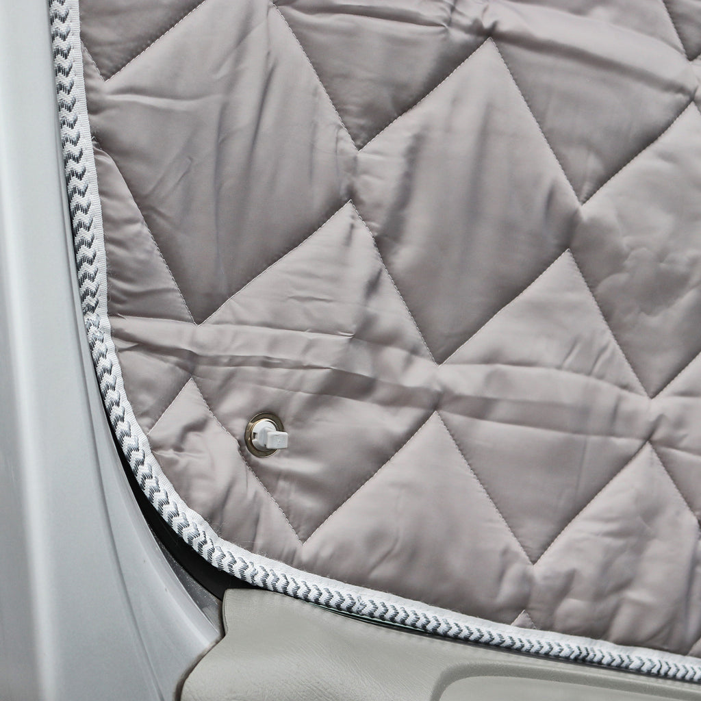 Ringsherum sind alle Schichten der Matte mit einem feinen Saum sauber vernäht, um ein hässliches Ausfransen zu vermeiden. Eingelassene Ösen dienen der einfachen Aufnahme von der im Lieferumfang enthaltenen Saugnapfbefestigung auf gereinigten Untergrund. So können die Thermomatten ohne Kleber oder Verschrauben an der Innenseite deines Campingbusses angebracht werden.