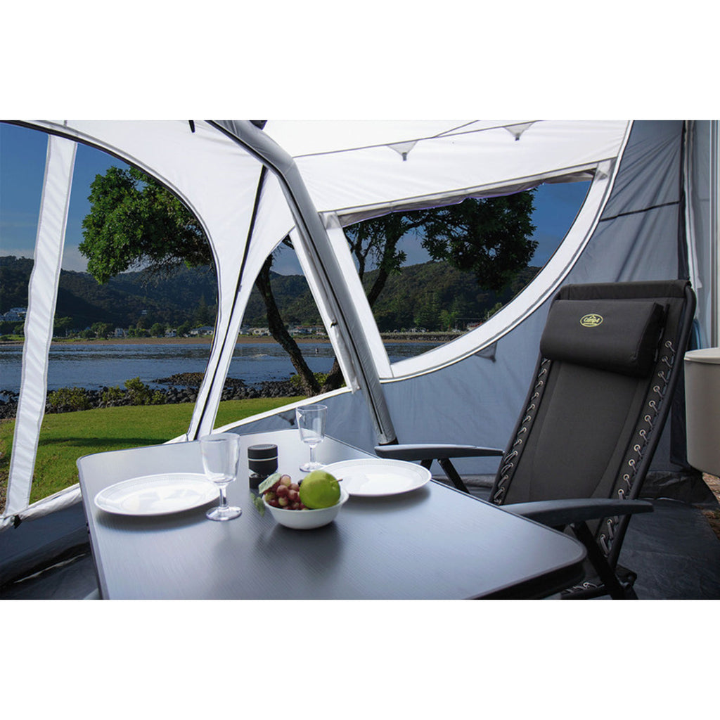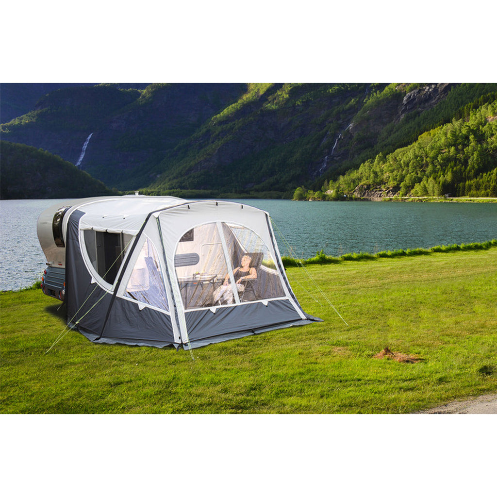 Das Vorzelt ist passend für den Adria Action 361 und bereichert deinen nächste Camping-Urlaub. Der geschaffene Wohnraum bietet idealen Platz zum Essen, Spielen oder Entspannen und bietet ausreichend Schutz vor Wettereinflüssen. Schnell und leicht aufgebaut durch das aufpumpen des Luftschlauches. Das Zelt schließt passgenau mit der Rundung der Außenwand des Adria Action ab. Seitliche Fenster mit Moskitonetzen und hochrollbaren Abdeckungen und Fronttür erweitern den Komfort. Die Tür ist auch als Sonnensegel nutzbar. Zusätzlich ist das Wohnwagen Vorzelt mit herausnehmbaren Boden und einer Windblende gegen Zugluft ausgestattet.
