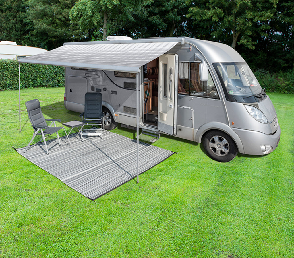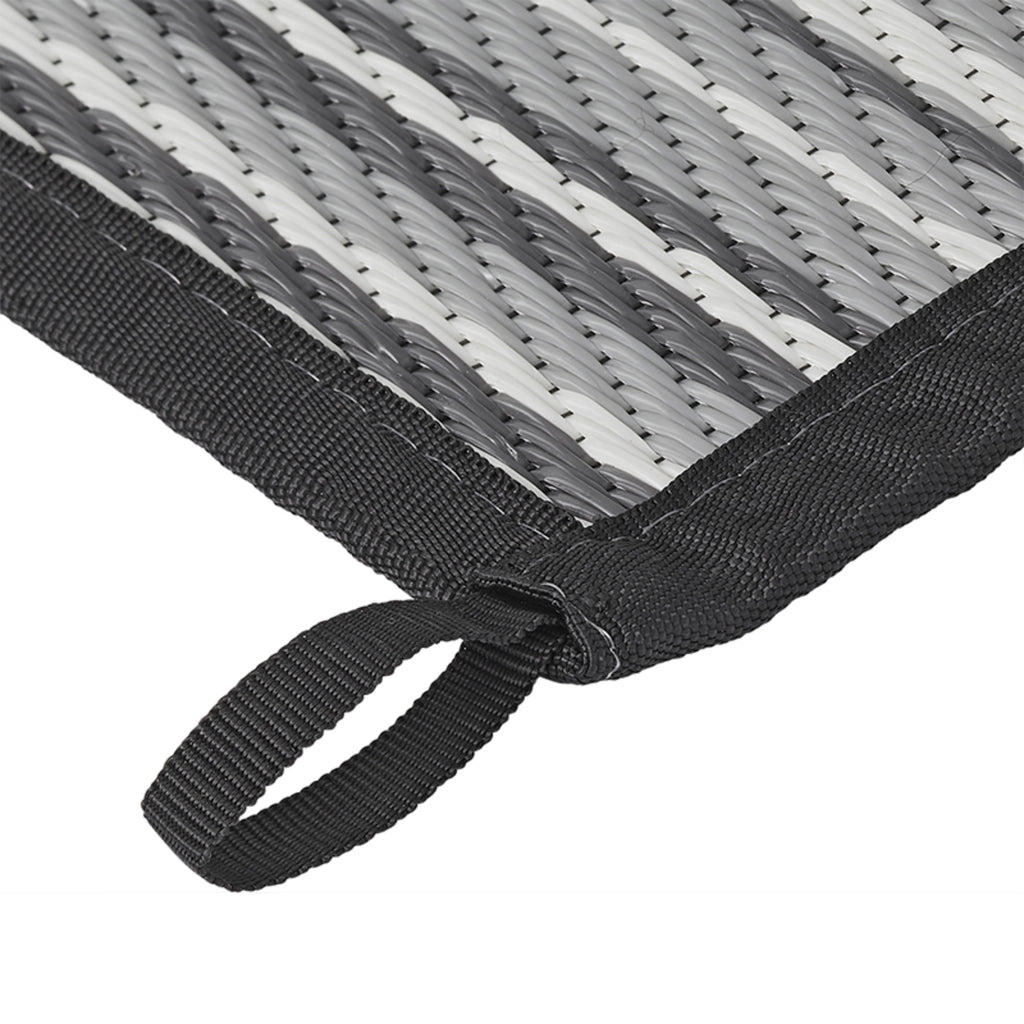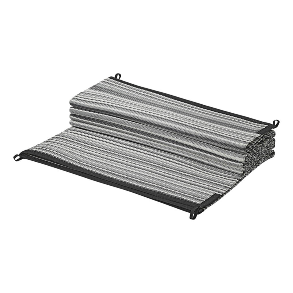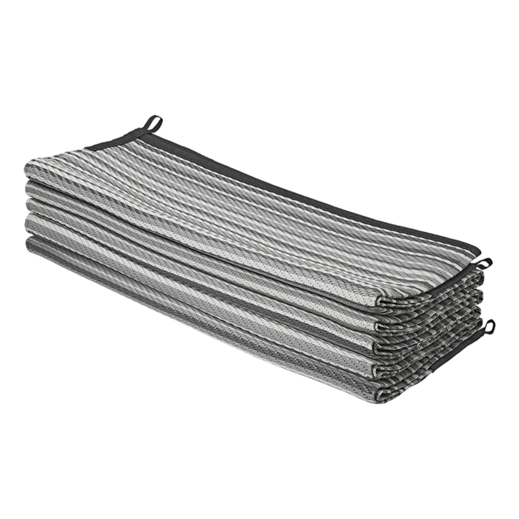 Stabile "Patio Matte" aus gewobenem Polyproplen, dadurch extrem strapazierfähig und schmutzresistent. Durch die Falttechnik , schnell und einfach ausgelegt. An allen 4 Ecken befinden sich Laschen zur Befestigung. Verstaut wird die Matte in einer praktischen Tragetasche.