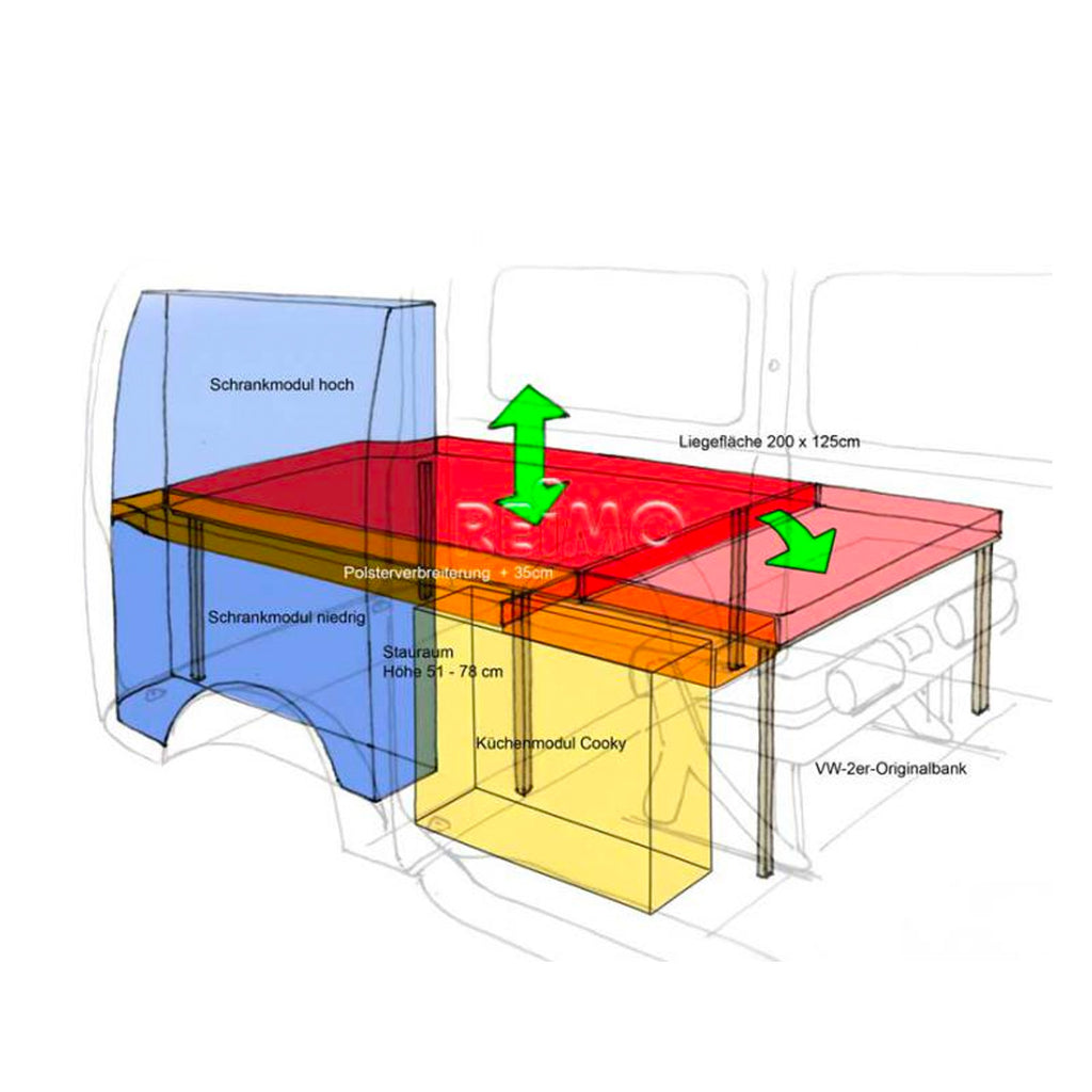 REIMO-Ausbau Bike & Surf für VW T5 / T6 Kombi oder Kastenwagen: Der VW Transporter kann mit den neu entwickelten BIKE & SURF-Komponenten im Handumdrehen in ein Schlafmobil mit riesigem Stauraum, Sitzgruppe, Tisch und Küchenbox verwandelt werden. Und das auch noch zu einem unglaublich günstigen Preis und zum Selbsteinbau.