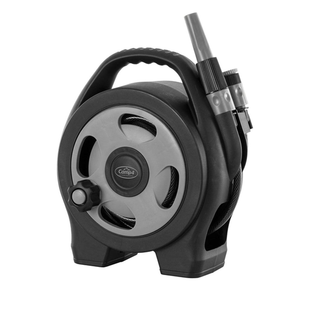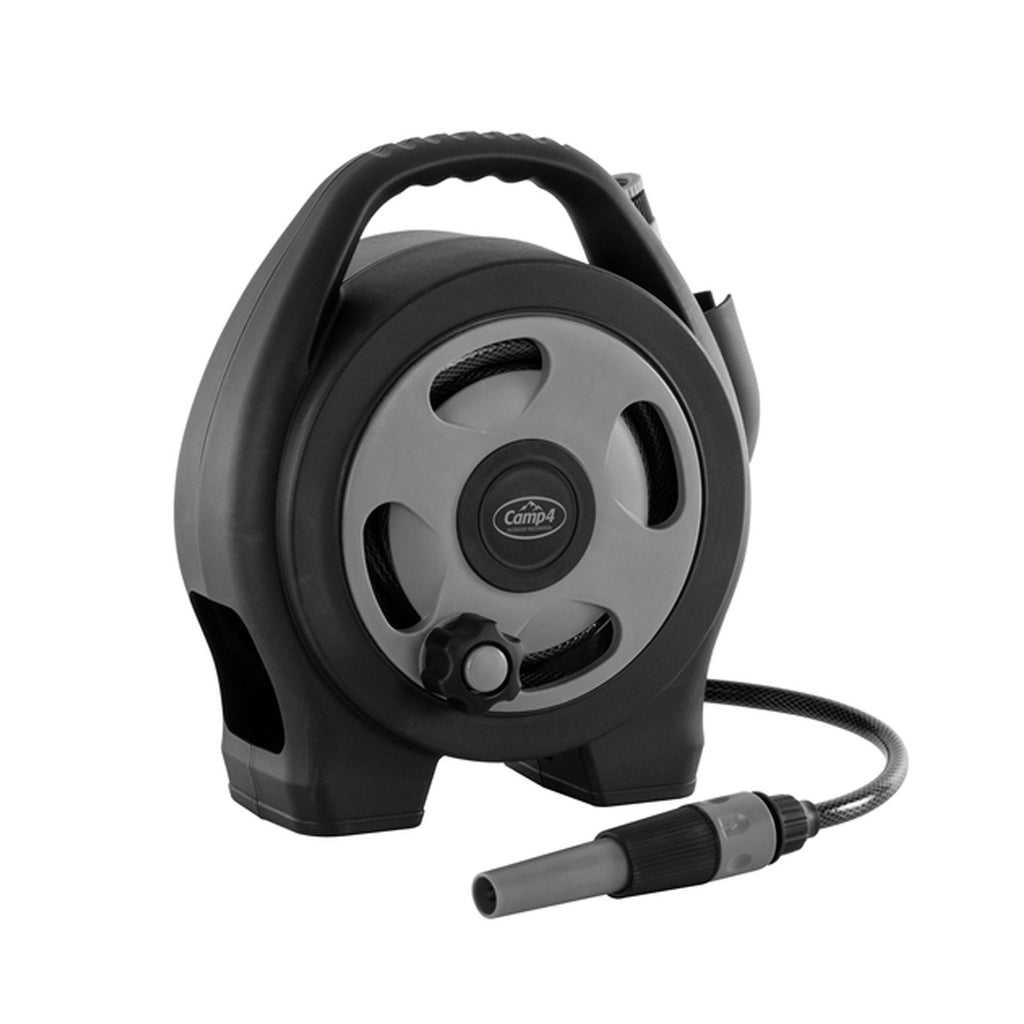 Lebensmittelechter Schlauch mit einer Gesamtlänge von 11,6 m (Ø 7,9 mm) - 10 m Schlauch auf der Trommel, 1,6 m Schlauch mit Wasseranschluss. Ideal geeignet zur Befüllung des Wassertanks beim Camping, zur Reingung des Fahrzeugs oder im Garten. Spritze mit stufenloser Verstellung und 3/4" Wasserhahnadapter.
