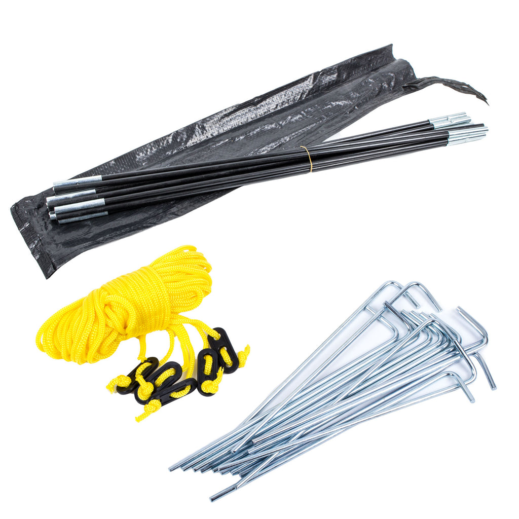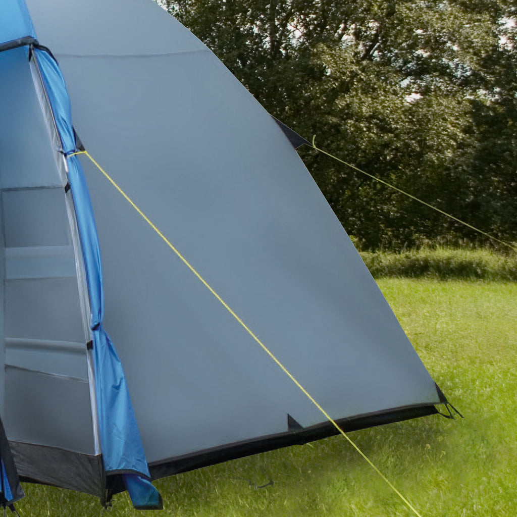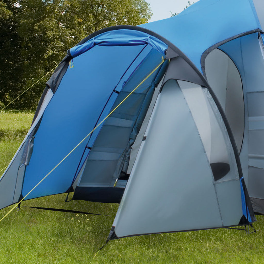 Kuppelzelt mit großem Vorraum und Schlafkabine für 5 Personen. Das Zelt eignet sich besonders für die große Familie oder für Gruppen. Stehhöhe 190 cm. Staufächer an der Schlafkabine für die Kleinutensilien. Innenzelt kann auch ohne Außenzelt aufgestellt werden, da das Gestänge innenliegend ist, ideal für sehr warme Sommernächte. Außenzelt verfügt über 2 Klarsichtfolienfenster. Maße: B390 x T320 x H200/170cm. Gestänge: Ø8,5mm Fiberglas. 2000mm Wassersäule. Material: Außenzelt 100% Polyester 185T, Innenzelt 100% Polyester Tafetta atmungsaktiv, Boden Polyethylen. Gewicht: ca. 7 kg. Packmaß: Ø16 x 65 cm. Mit Packtasche.
