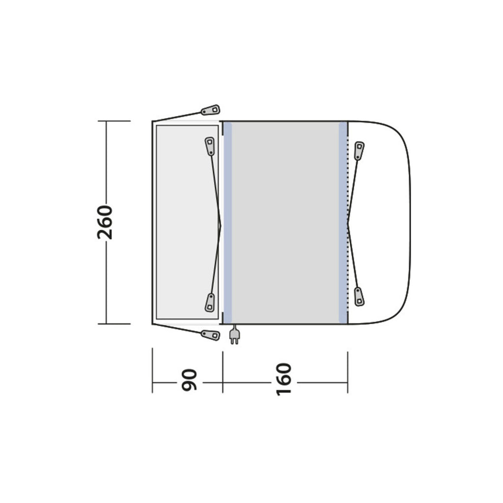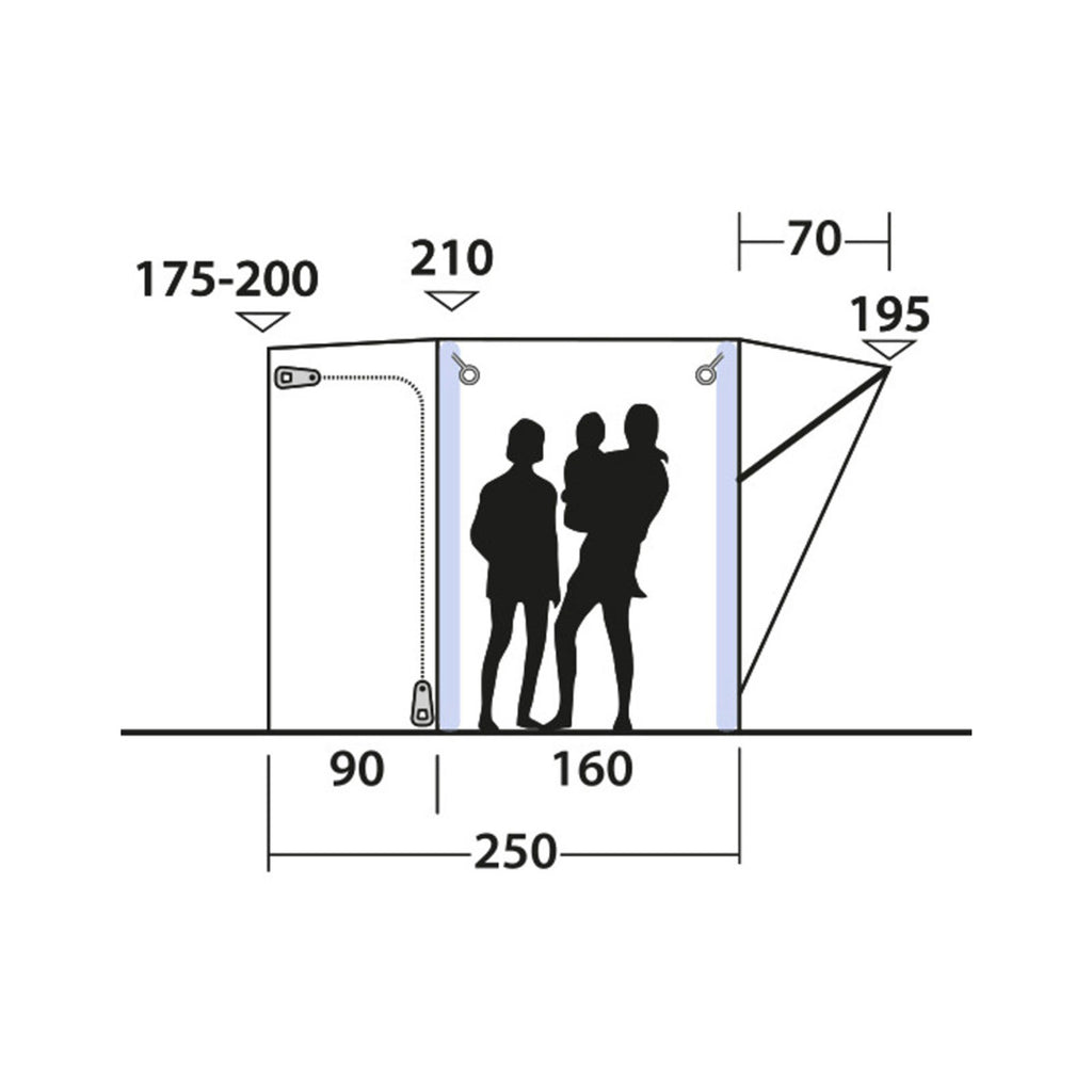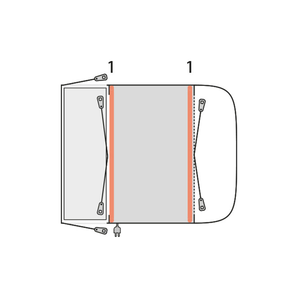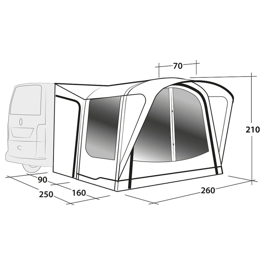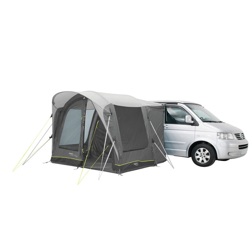 Das Busvorzelt ist trotz der kompakten Größe sehr geräumig. Der Wohnbereich sorgt mit großen getönten Fenstern für einen lichtdurchfluteten Innenraum und lädt zum Essen, Spielen oder Entspannen ein und bietet gleichzeitig ausreichend Schutz vor Wettereinflüssen. Aufrollbare Vorhänge mit festen Aufhängepunkten schützen bei Bedarf vor neugierigen Blicken. Der Schleusenbereich mit seinen beiden Seiteneingängen kann mit der mitgelieferten Bodenplane zusätzlich als Wohnraum genutzt werden. Die komplett zu öffnende Front ist mit einem Moskitonetz ausgestattet und wird durch ein Vordach geschützt. Das Teilzeit eignet sich ideal für deinen Campingbus, Kastenwagen oder Van und bereichert deinen nächsten Camping-Urlaub.