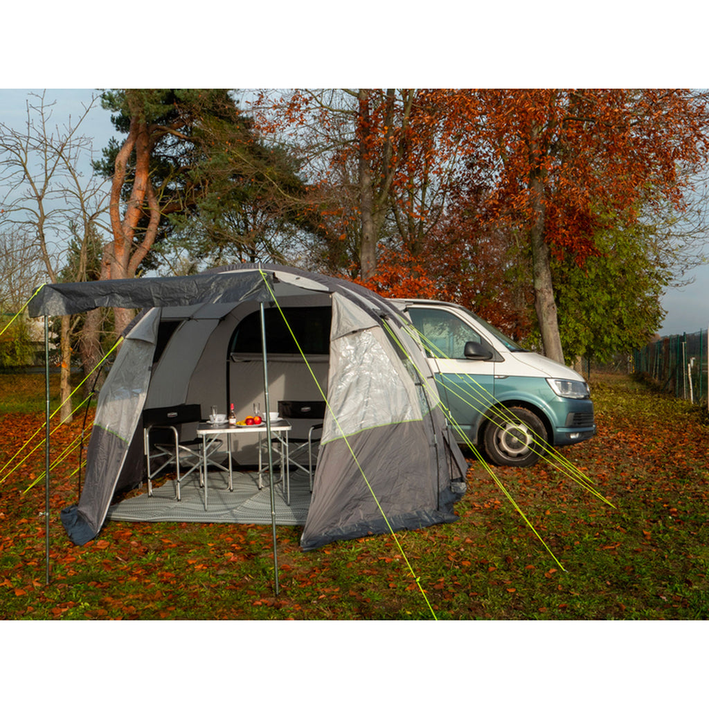 Freistehendes 2-Tunnel-Vorzelt mit Fiberglas und Stahl-Gestänge. Eine 90 cm Schleuse mit Türen rechts und links ist integriert. Das Drive Away Zelt bietet ausreichend Fläche für entspannte Stunden auf dem Campingplatz und kann ganz einfach an Ort und Stelle stehen bleiben, wenn Du mit dem Auto die Umgebung erkunden möchtest.
