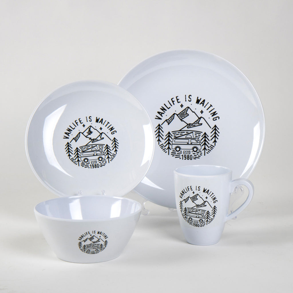 Das junge Design des Melamin Geschirrsets VANLIFE sorgt für Urlaubsstimmung. Es besteht aus jeweils 4 Esstellern, Desserttellern, Schüsseln und Tassen mit Henkel. Das hochwertige Melamin ist lebensmittelecht und spülmaschinengeeignet.