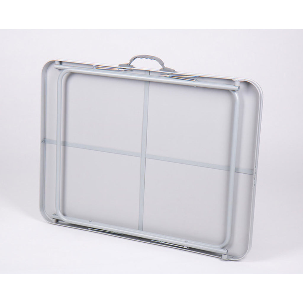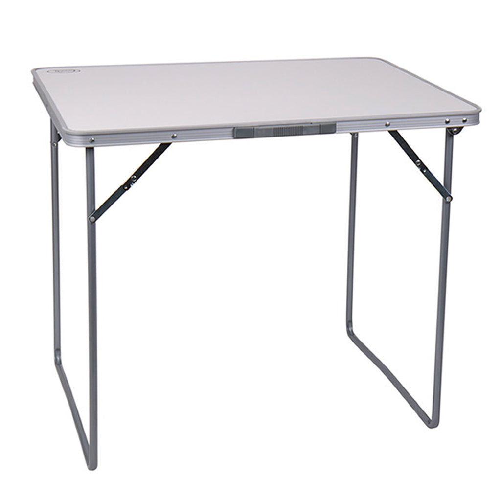 Kleiner und handlicher Campingtisch für 2 - 4 Personen. Robuste MDF-Tischplatte in zeitlosem Hellgrau. Kompaktes Packmaß durch einklappbare Füße. Dank seitlichem Griff und einem Aluminiumgestell lässt sich der faltbare Campingtisch der Serie Jesper leicht transportieren.