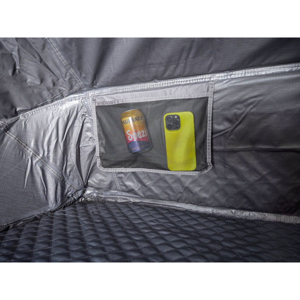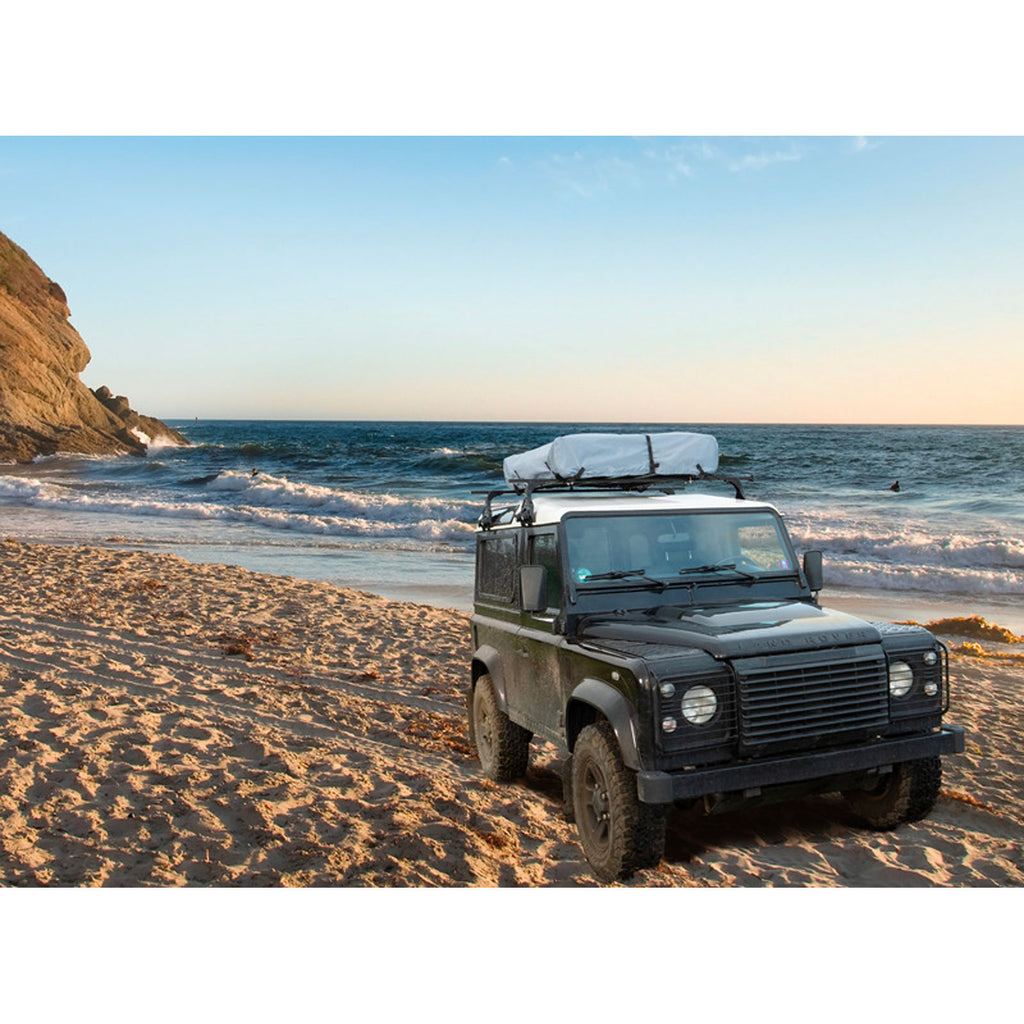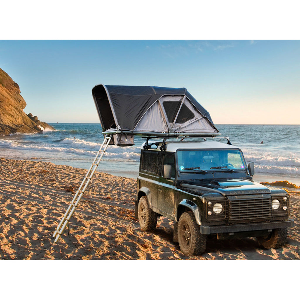 Dachzelt in neuem Design zum manuellen Aufklappen – ideal geeignet für PKW, Van und SUV. Das Klappzelt ist schnell aufgeklappt und bietet einen komfortablen Schlafplatz für 2 Personen. Moskitonetze in allen Zeltöffnungen bieten Schutz vor lästigen Insekten. Der Unterboden besteht aus einem soliden Aluminiumrahmen. Zusätzlich befinden sich am Eingang zwei praktische Taschen, in denen die Schuhe verstaut werden können. Geliefert wird das Dachzelt mit einer bequemen, 7 cm dicken Matratze (mit abnehmbarem waschbarem Bezug) und einer Aluminium-Teleskopleiter. Eine robuste PVC-Abdeckplane schützt während der Fahrt vor Regen und Schmutz.