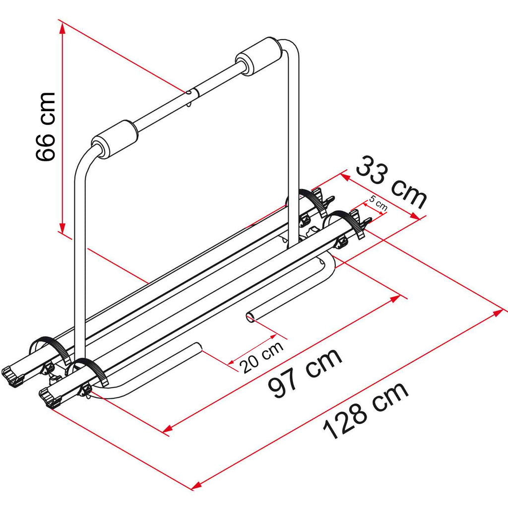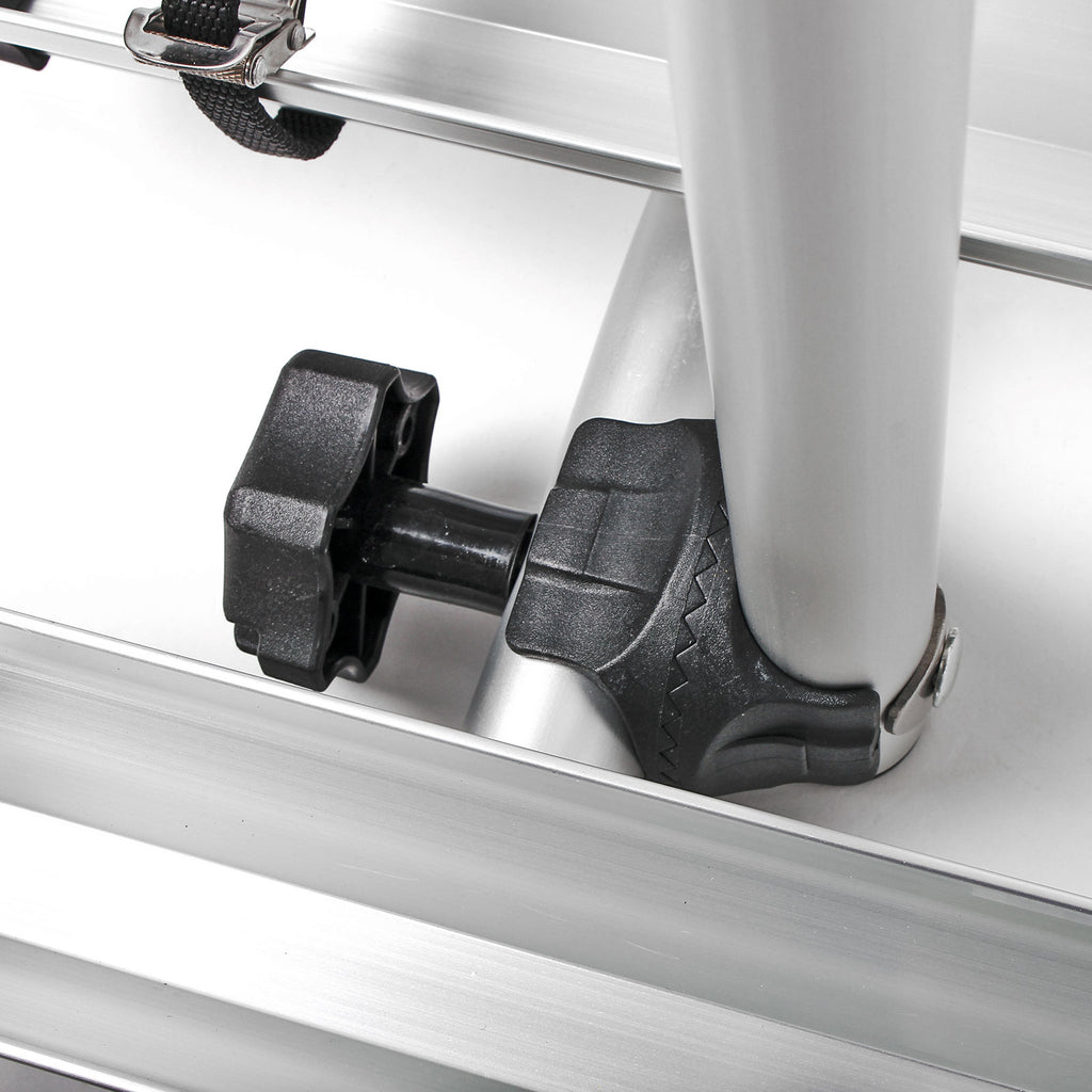 Der Deichsel-Fahrradträger Caravan Eco bietet Platz für zwei Fahrräder, damit Sie künftig auch auf dem Campingplatz mobil unterwegs sind. Durch die im Lieferumfang enthaltenen U-Bügeln, lässt sich der Camping-Fahrradträger auf fast allen herkömmlichen V-Deichseln befestigen. Befestigungsgurte an Vorder- und Rückseite der Fahrradschienen tragen zu einer sicheren Befestigung der Fahrräder bei. Des Weiteren befinden sich an der Oberseite des Deichsel-Fahrradträgers zwei Schaumstoffpolster, um ein verkratzen des Fahrradrahmens zu verhindern. Zwei weitere Befestigungsriemen dienen zusätzlich als Absicherung der Räder. So wird bei rauer Fahrweise schlimmeres verhindert. Zudem ist der Deichsel-Fahrradträger mit einer Kippfunktion ausgestattet, um einen Zugang zum Gaskasten sicherzustellen. Die Schiene hat eine Breite von 5cm und verläuft nach unten hin schmaler bis zu 2 cm. Empfohlene Höchstgeschwindigkeit: 80 km/h