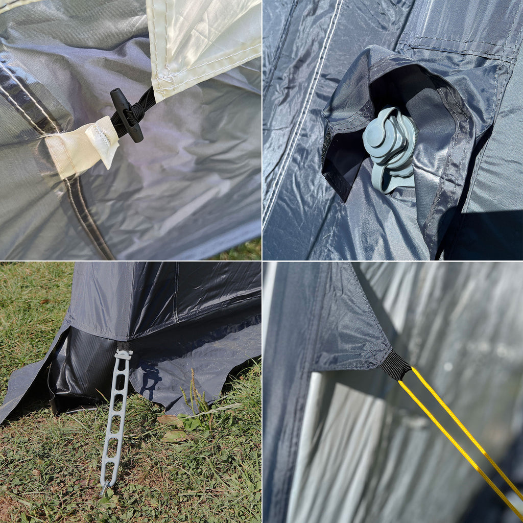 Das Luft-Vorzelt eignet sich optimal für Wohnwagen, Wohnmobile und Caravans und bereichert deinen nächsten Camping-Urlaub. Dank der 4 separaten Luftschläuche ist das Vorzelt schnell und einfach auf- & abgebaut. Für eine optimale Belüftung lassen sich die Frontteile aufrollen oder auch als Sonnensegel aufstellen. Die transparenten Fenster sorgen für viel Helligkeit und eine angenehme Wohnatmosphäre.