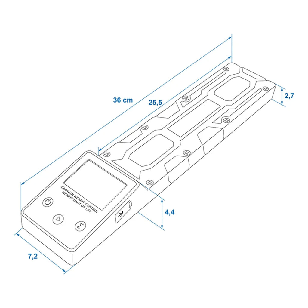 Diese digitale Anhängerwaage ist ideal für Transporter, Anhänger und Wohnmobile. Die Wohnwagenwaage misst präzise das Gesamtgewicht, die Gewichtsverteilung und die Achslast bis 1500 kg. Mit Abmessungen von 360x72x44 mm, IPX4-Wasserdichtigkeit und einem wiederaufladbaren Akku mit Type-C-Schnittstelle ist diese Digitalwaage für Anhänger robust und einfach zu handhaben.