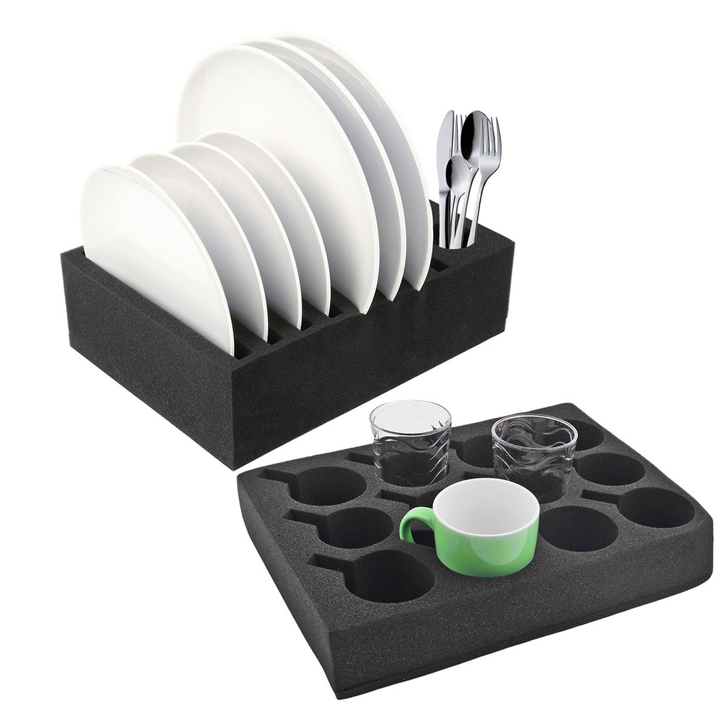 Der Schaumstoffhalterungen mit den passgenauen Vertiefungen sind von besonders hoher Qualität und daher auch leicht zu reinigen und rutschfest. Außerdem verschafft Dir die Nutzung eines solchen Gummikunststoffblocks himmlische Ruhe, denn klapperndes Geschirr war mit diesen cleveren Reisegimmicks gestern.