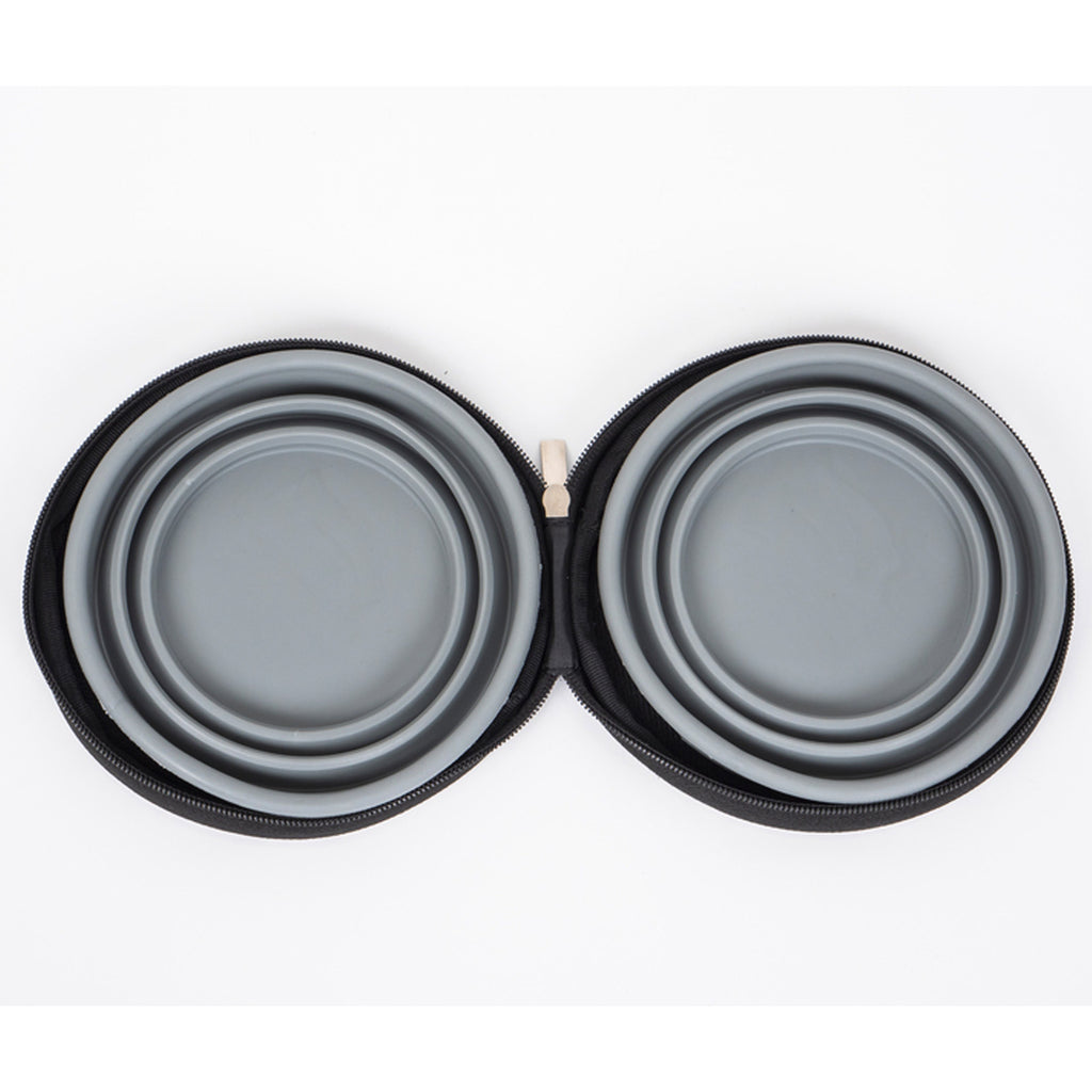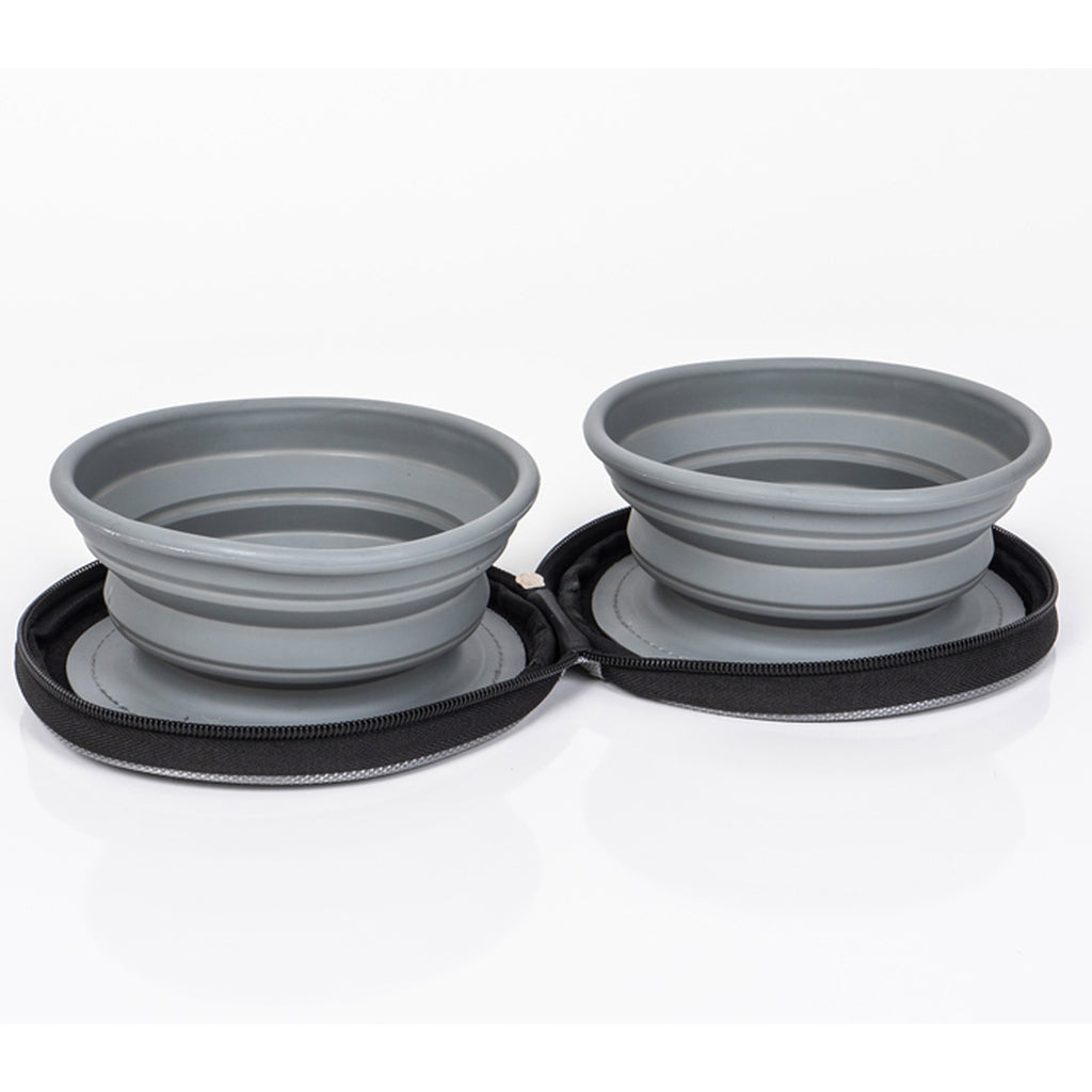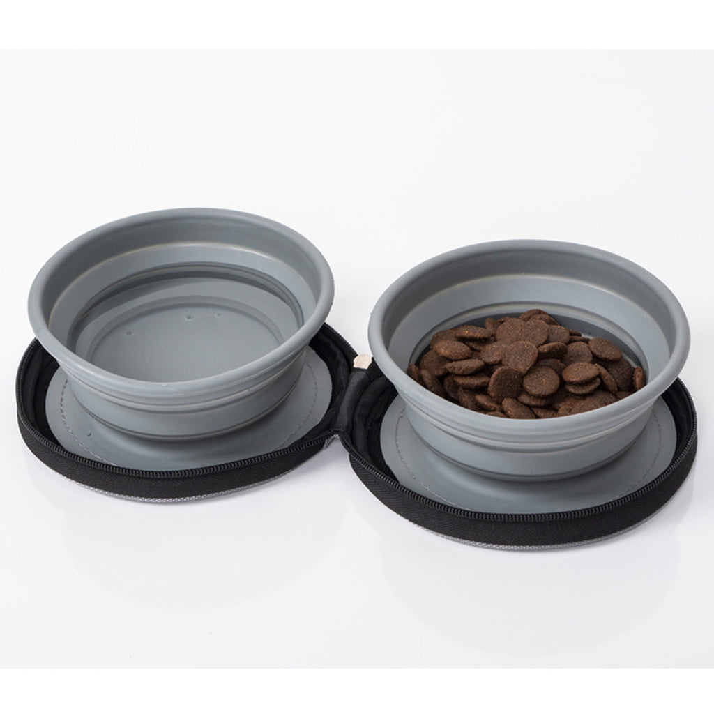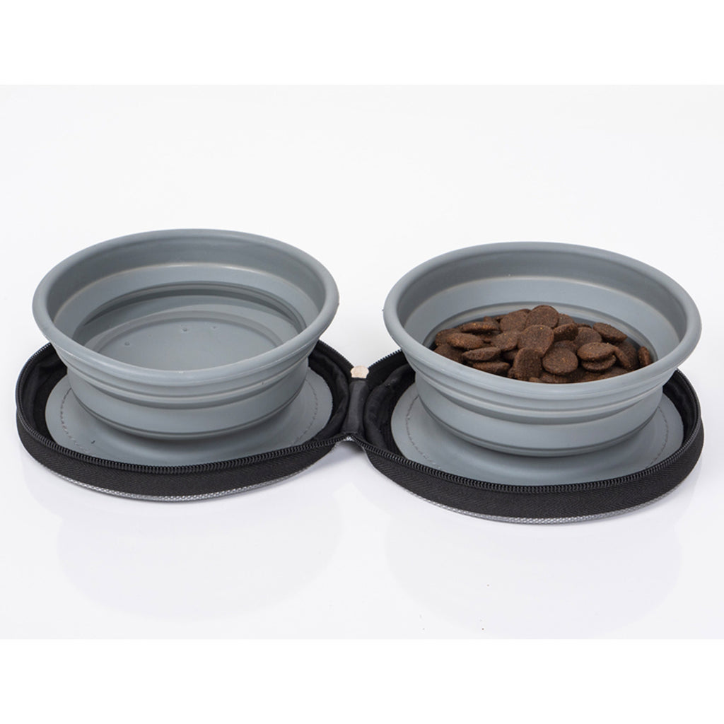 Öffnet man die stabile Tasche mit Reißverschluss findet man 2 faltbare Silikonnäpfe. Die Silikonnäpfe sind am Boden mit Klett an der Tasche befestigt und können somit jederzeit problemlos entfernt und gereinigt. Diese haben ein hohes Fassungsvermögen von max. 700 ml.