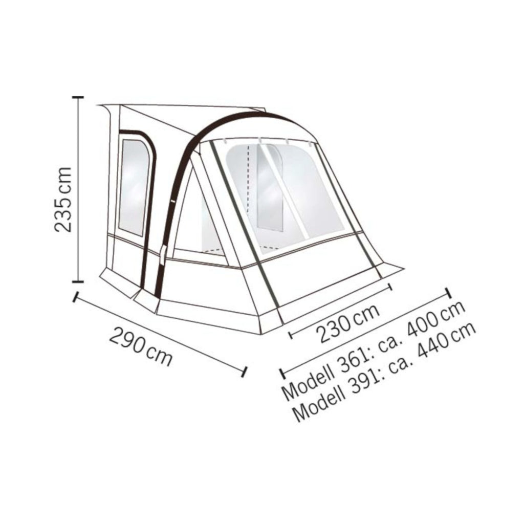 Schnell und leicht aufgebaut durch das Aufpumpen des Luftschlauches. Das Zelt schließt passgenau mit der Rundung der Außenwand des Adria Action ab. Seitliche Fenster mit Moskitonetzen und hochrollbaren Abdeckungen, Fronttür aufrollbar oder als Sonnensegel nutzbar. Ausgestattet mit herausnehmbarem Boden und einer Windblende gegen Zugluft.