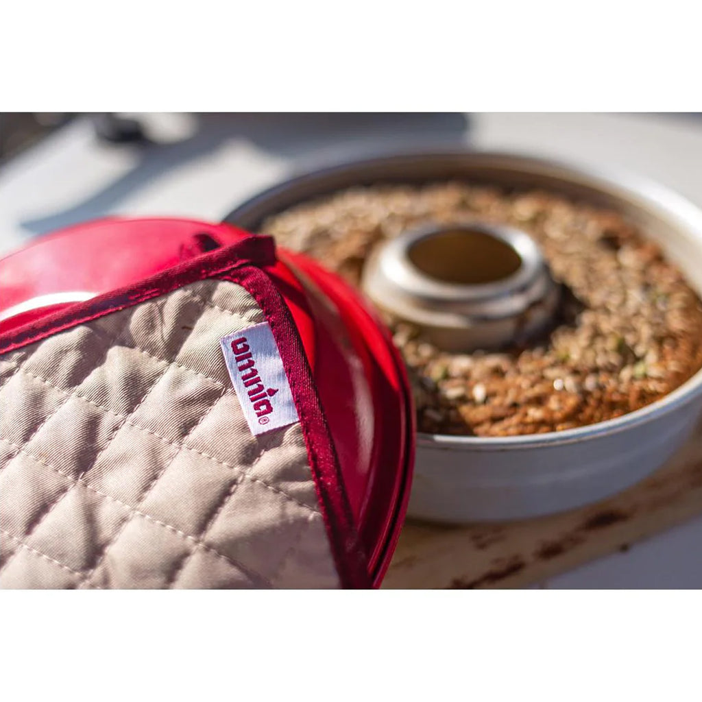 Zwei stilvolle Topflappen in beige mit weinrotem Rand. Passend für den Omnia Campingbackofen zum problemlosen Anfassen des Omnia Deckels und der Backform. Bis 60° waschbar.