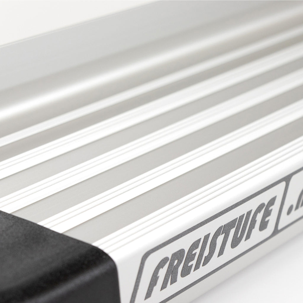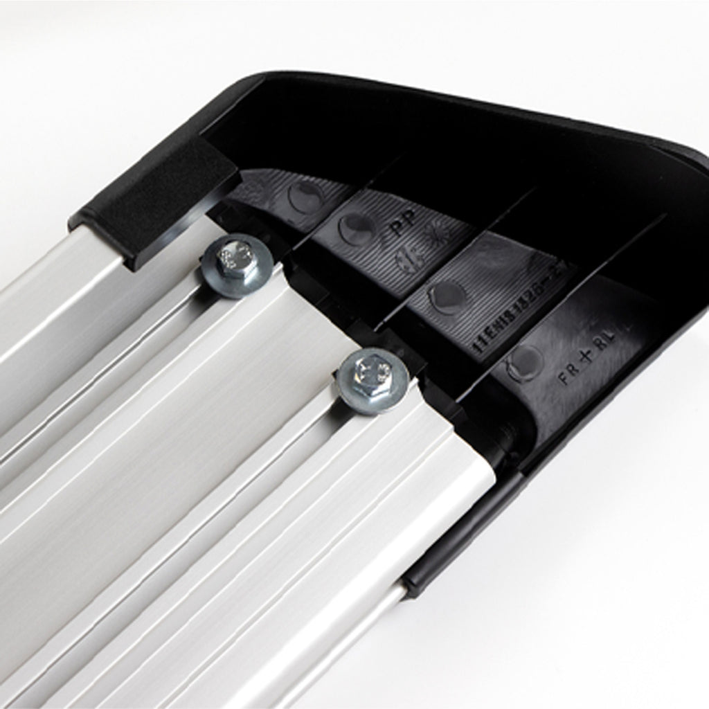 Die Trittstufen aus eloxierten Aluminiumprofilen, sind ausgestattet mit verschraubten und optimierten Sicherheits-Kunststoffabdeckungen an den Enden und rutschhemmender Profilierung. Der Freistufensatz wird am und unter dem Fahrzeugholm fest verschraubt, somit verändert sich die Einstiegshöhe von 46 cm auf angenehme und bequeme 23 cm.