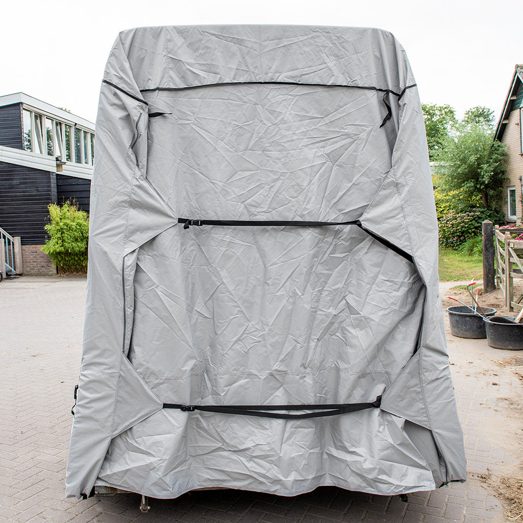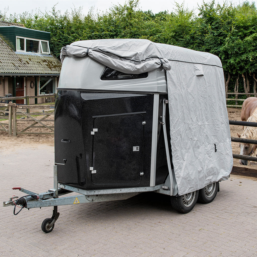 Universal passende Vollabdeckung für Pferdetransportanhänger, gefertigt aus strapazierfähigem Oxford 300D Material. Zahlreiche Verzurrgurte lassen Sie die Plane zuverlässig befestigen. Zutritt ist durch öffenbare Segmente vorne links, recht und hinten möglich.