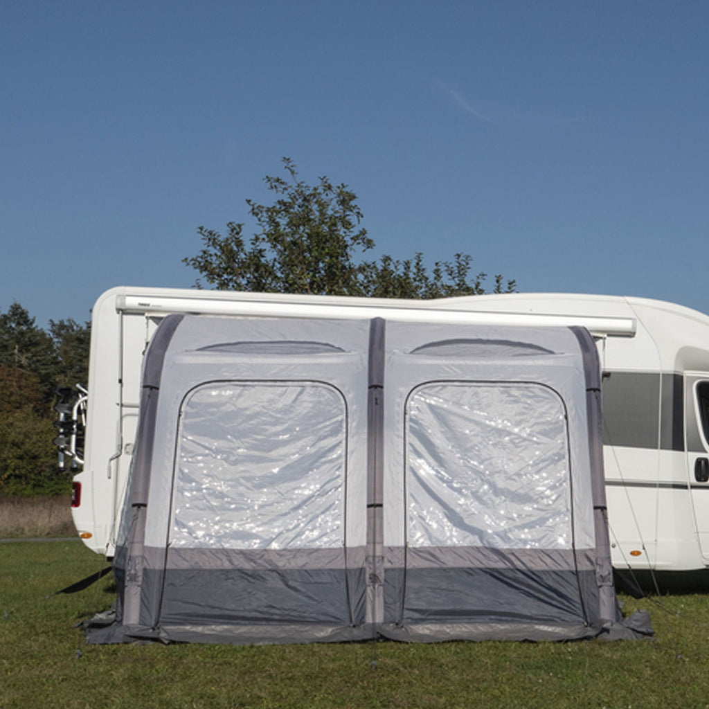 Die Reisemobil-Luftvorzelte Marina Air High in klassischer Form mit nur einem Luftschlauch für einen schnellen Auf- und Abbau in Premium-Qualität. Die Front mit 3 großen Fenstern besteht aus 3 Lagen (transparentem PVC, Moskitonetz und Abdeckung innen) und kann komplett geöffnet werden. Außerdem können alle Front-Panels entnommen oder als Sonnensegel genutzt wer-den. Die Seitenwände haben eine Tür und ein Moskitonetz-Fenster mit Abdeckung außen.