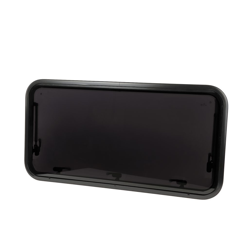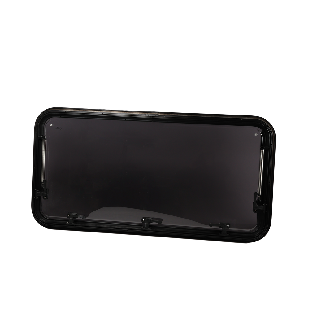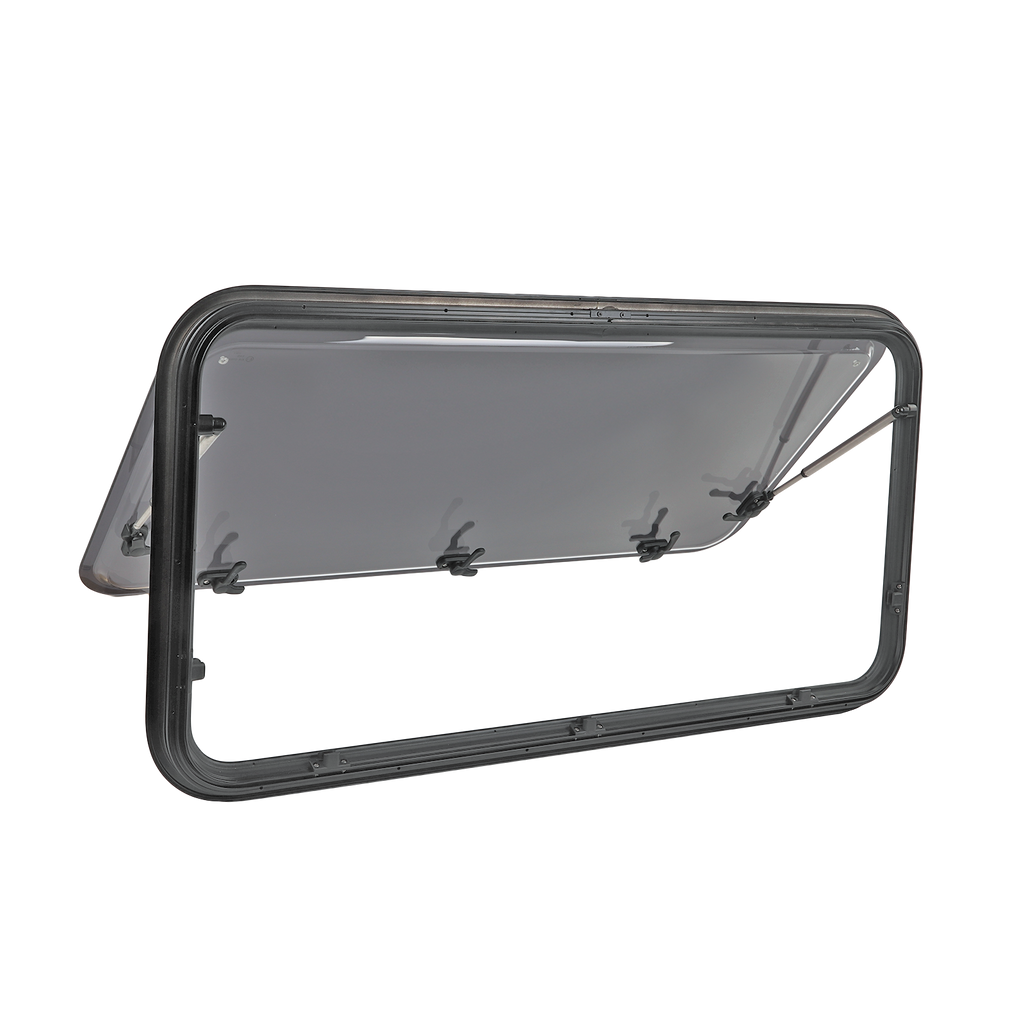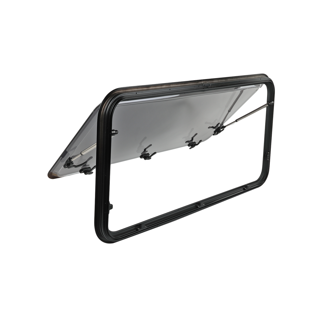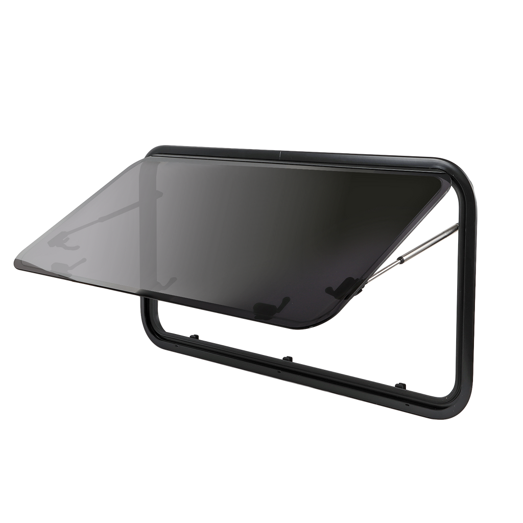 Das Ausstellfenster RW Compact ist ein echter Hingucker! Die Scheibe schließt flächenbündig mit dem hochwertigen, schwarzen Aluminiumrahmen ab. Das Fenster lässt sich über den Teleskopaussteller lässt sich das Fenster verstellen. Die getönte doppel-acrylverglaste Scheibe isoliert hervorragend und bietet dadurch mehr Privatsphäre durch Sichtschutz.