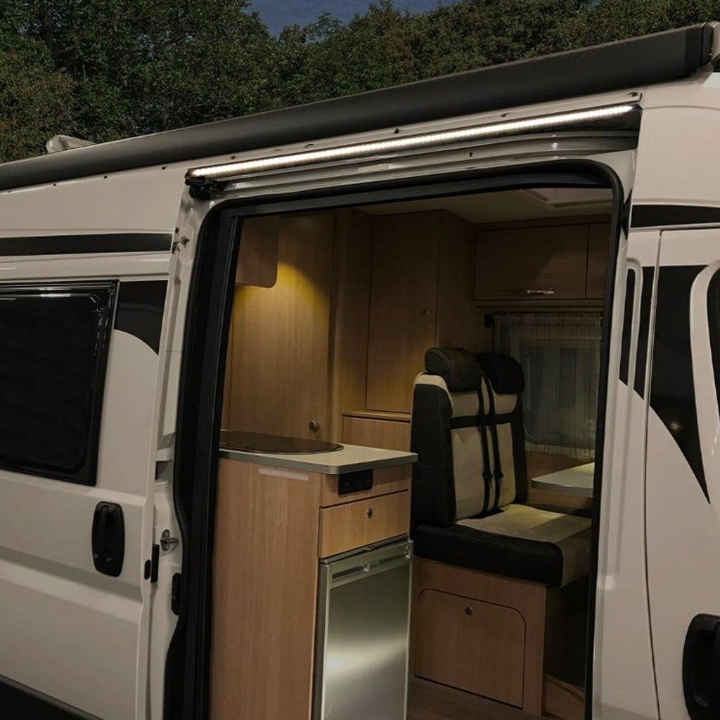 Die Leuchte passt genau in die Öffnung der breiteren Schiebetüren dieser Wohnmobile und leuchtet den Eingang über die ganze Breite aus.