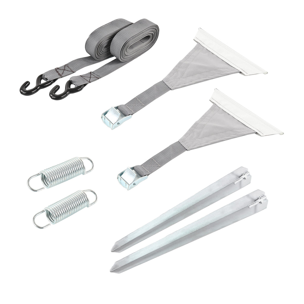 Lieferumfang: 8-teiliges Wamovo Sturm Abspannset bestehend aus: 2x Spannband, 2x Spannfeder, 2x Hering, 2x Adapter ca. ø7,2-7,5 mm