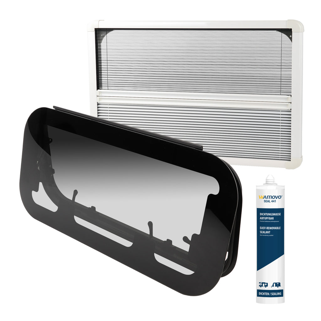Lieferumfang: 1x Wamovo Echtglas Seitenfenster 70x30cm inkl. Insektenschutz, Verdunkelungsrollo und Dichtmasse