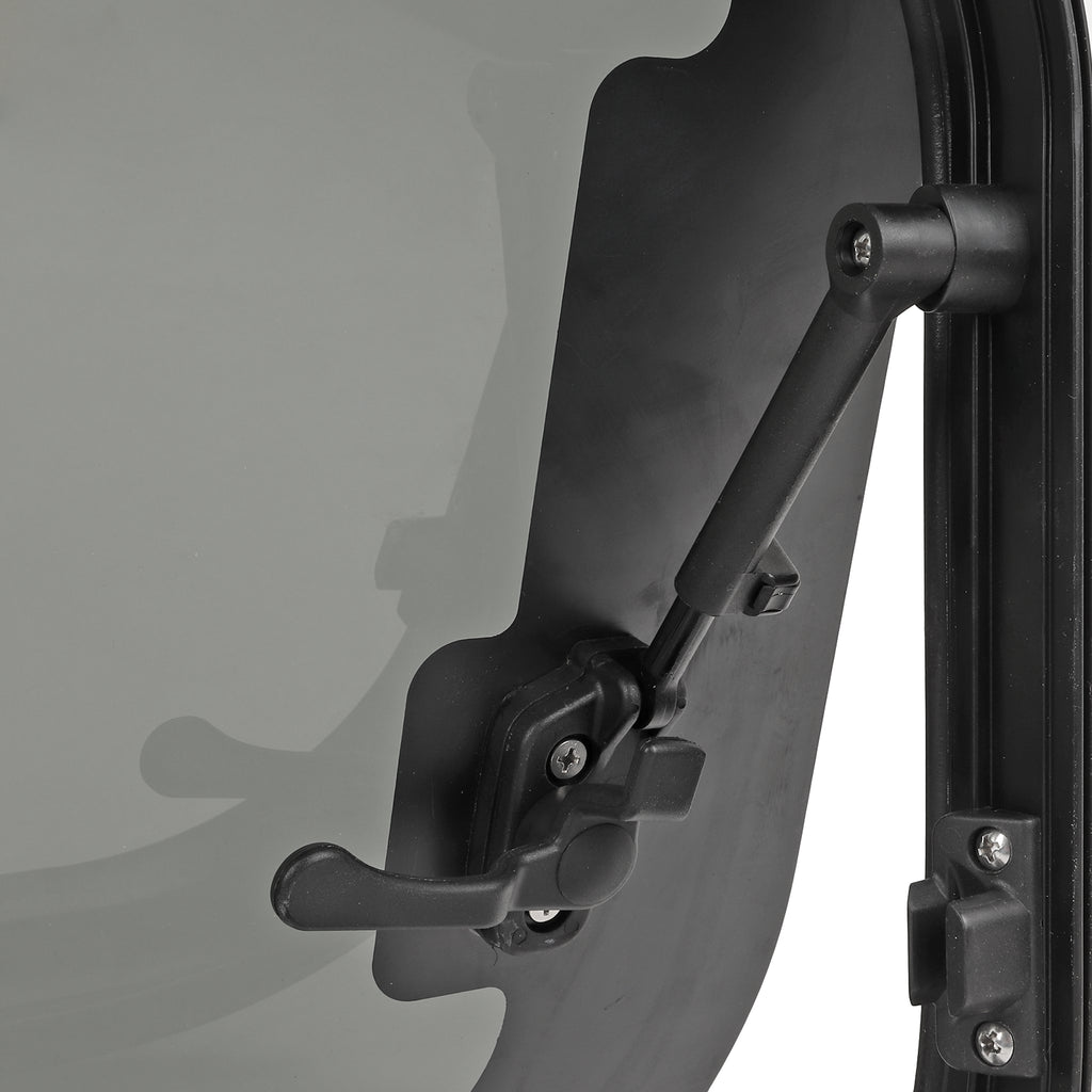 Das Echtglas - Ausstellfenster ist ein optisches Highlight! Die Scheibe des Fenster schließt nahtlos aufliegend mit dem hochwertigen, schwarzen Rahmen ab. Das Fenster lässt sich über den Teleskopaussteller verstellen. Die getönte Echtglas-Scheibe bietet Privatsphäre, durch Sichtschutz.