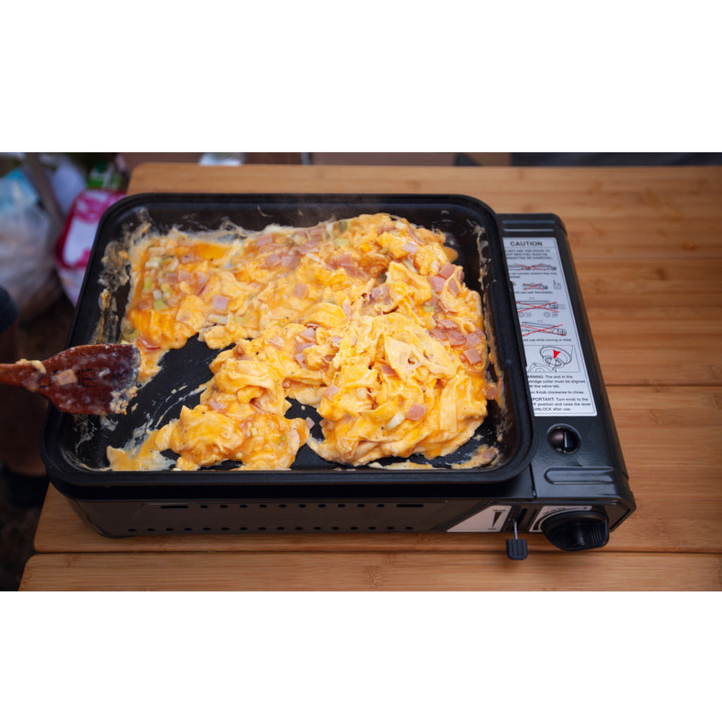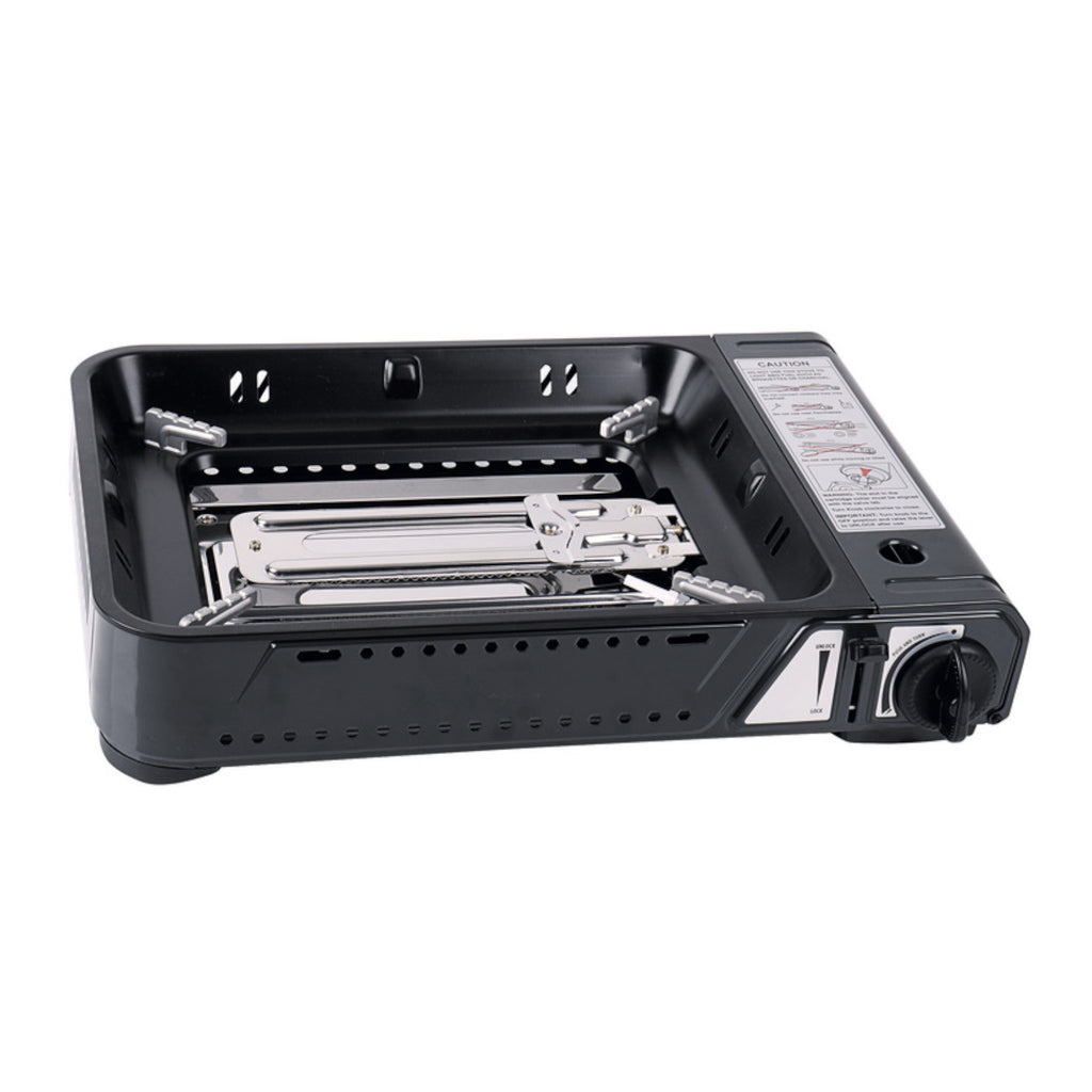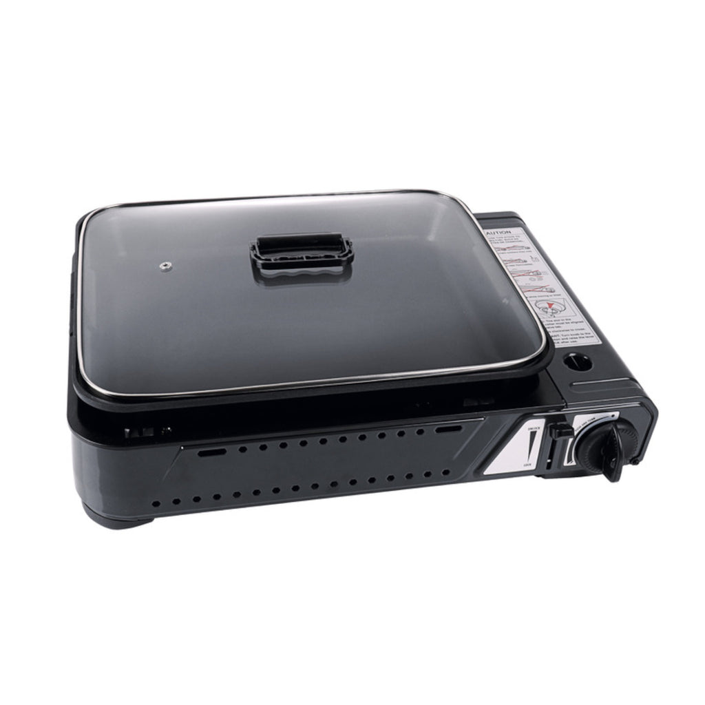 Tragbarer Kartuschenkocher mit tiefer antihaftbeschichteter Pfanne und Glasdeckel für sicheres Kochen. Die platzsparende Alternative zum Gaskocher mit Topfset.