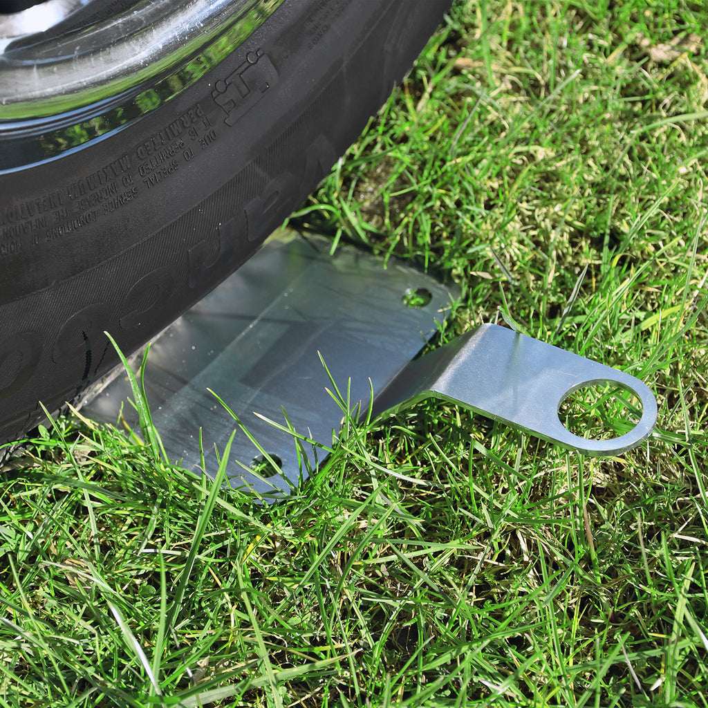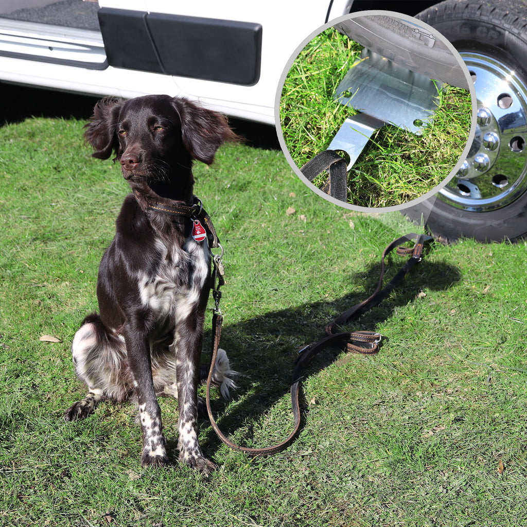 Mit dem Dogholder lassen sich große Hunde und sogar Fahrräder sicher befestigen. Die Edelstahlplatte mit großer Öse einfach vor ein Rad legen, dann mit dem Reifen des Autos / Wohnwagens / Wohnmobils auf die Platte fahren. Jetzt ist der Dogholder fest mit dem Boden verbunden. Aufgrund des Fahrzeuggewichts ist ein herausziehen unmöglich.