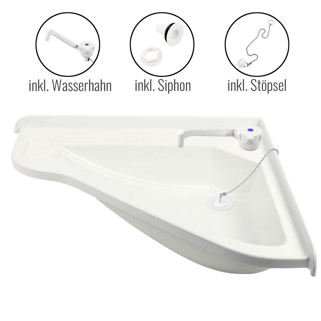 Das Wohnmobil Waschbecken in der Super Size Ausführung misst 58 x 54 x 9 cm und besteht aus robustem ABS Kunststoff. Linksseitig befindet sich eine praktische Aussparung für Seife und oberhalb eine 9 cm breite Ablagefläche für WC-Utensilien. Des Weiteren lässt sich das großzügige Eckwaschbecken leicht reinigen. Mit ein paar Tropfen Reinigungsmittel und Wasser löst sich jeder Schmutz und die Wanne wird wieder schön glänzend. Für einen festen Anbau werden lediglich Schrauben und etwas Silikon benötigt.