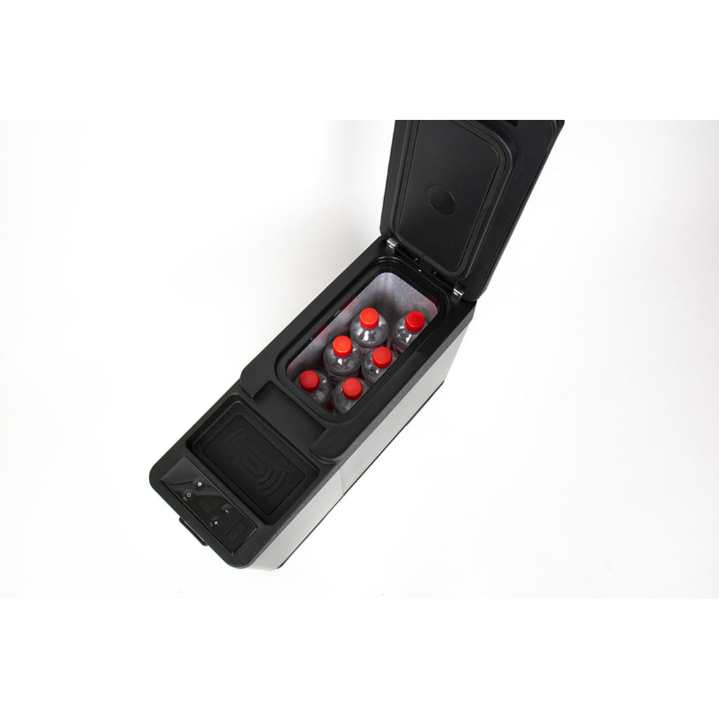 Die multifunktionale Mittelkonsole mit integrierter 12 V / 24 V Kompressor-Kühlbox passt ideal in deinen Campervan oder Kastenwagen und versorgt dich unterwegs stets mit gekühlten Getränken oder Lebensmitteln. Dank der Kühlung bis -15°C kannst du dich im Sommer mit einem Eis abkühlen. Zusätzlich ist die Kühlbox mit einer induktiven Ladestation für dein Smartphone ausgestattet. Geliefert wird der kleine Kühlschrank mit einer separaten Montageplatte, welche eine schnelle und einfache Befestigung im Fahrzeug ermöglicht. Der Klappdeckel des Kühlfachs ist mit Kunstleder bezogen und Ziernähte sorgen für einen edlen Look.
