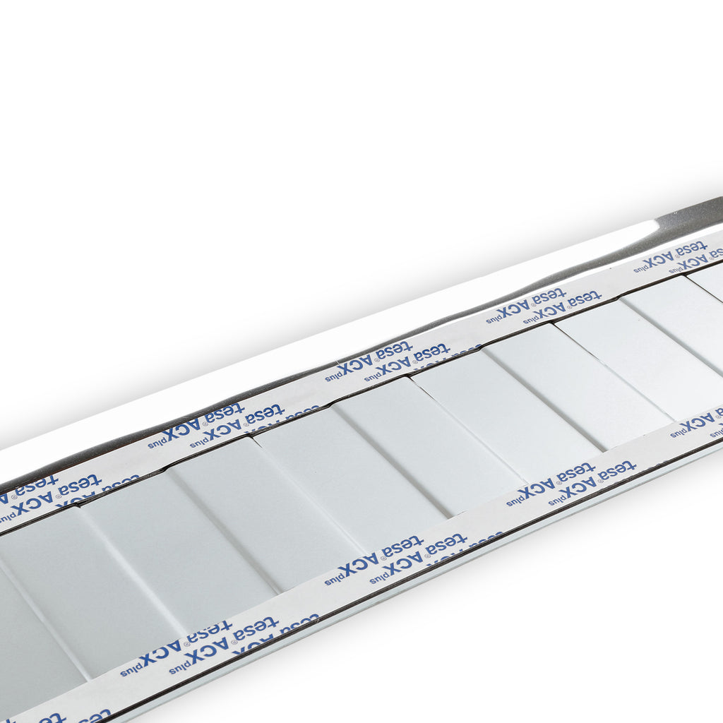 CNC gefräster Ladekantenschutz aus Edelstahl, passend für VW T6 & T6.1. Durch das auf der Rückseite angebrachte 3M® Klebebandes, lässt sich die Schutzleiste sicher an der Heckstoßstange befestigen.