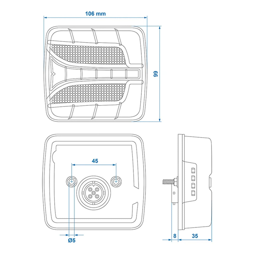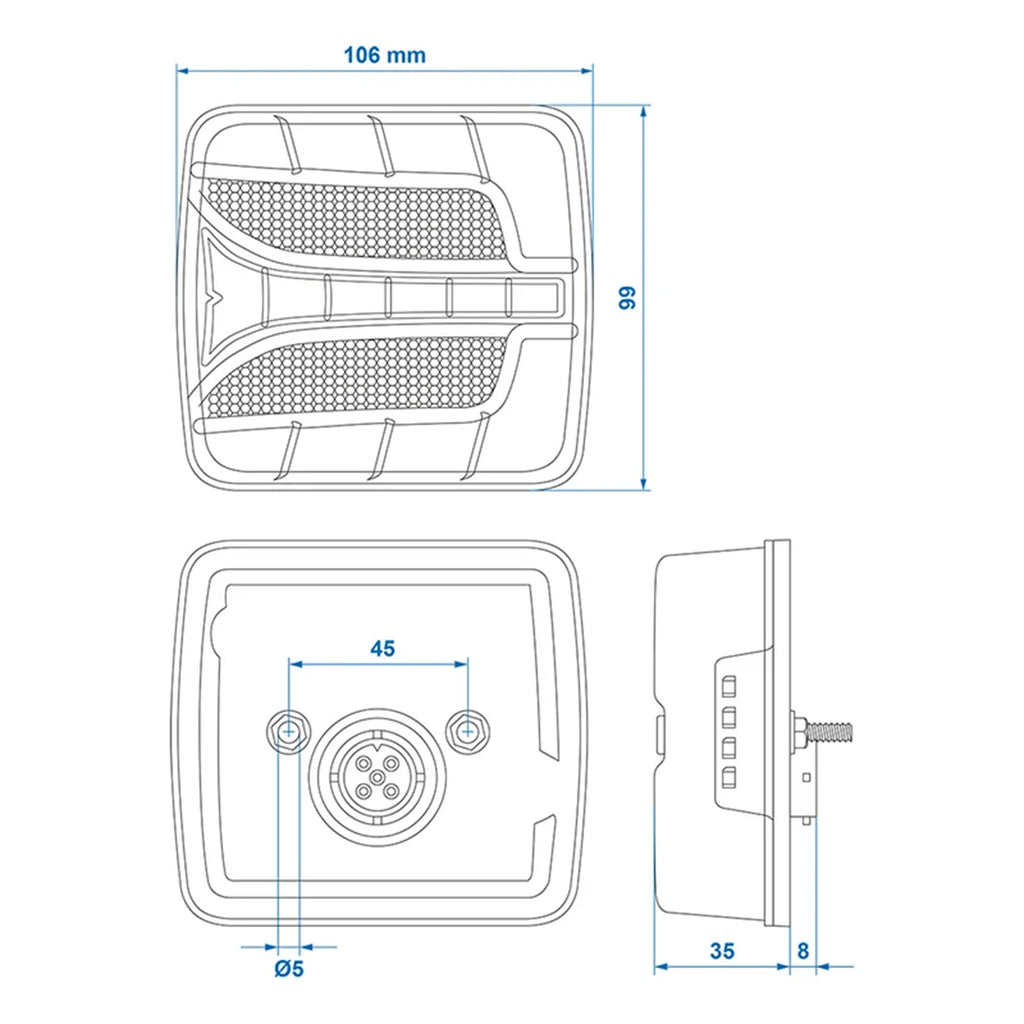 Die LED Rückleuchte links (106 x 99 mm) ist eine leistungsstarke und zuverlässige Mehrkammerleuchte für Anhänger, Nutzfahrzeuge und Wohnmobile. Sie vereint vier Funktionen in einer kompakten Bauweise und ist dank IP67-Schutzklasse besonders widerstandsfähig gegenüber Wasser und Staub.