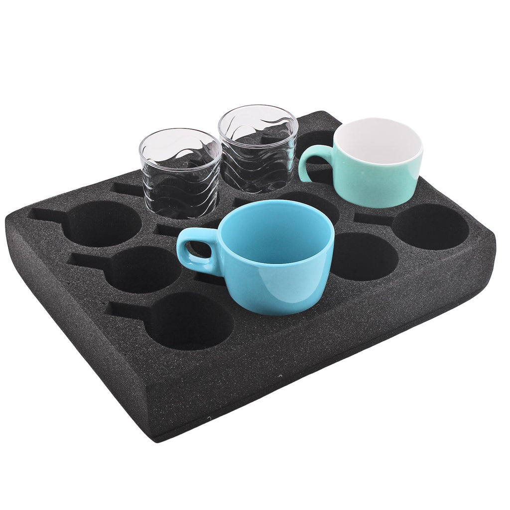 Weich gebettet ermöglicht es dieser praktische Alltagshelfer, deine Tassen, Gläser und Becher sicher im Wohnwagen oder Wohnmobil zu verstauen. Gut sortiert stehen diese auch auf abenteuerlich-wackeligen Pisten fest und bruchsicher. Der Halterungsblock ist aus einem speziellen, formstabilen Schaumstoff gefertigt, der trotzdem noch Spielraum für Bewegung von außen lässt und somit weder durch Überspannung der Gefäße, noch durch zu lockeren Sitz zu Scherben führt, auch wenn diese ja bekanntlich Glück bringen.