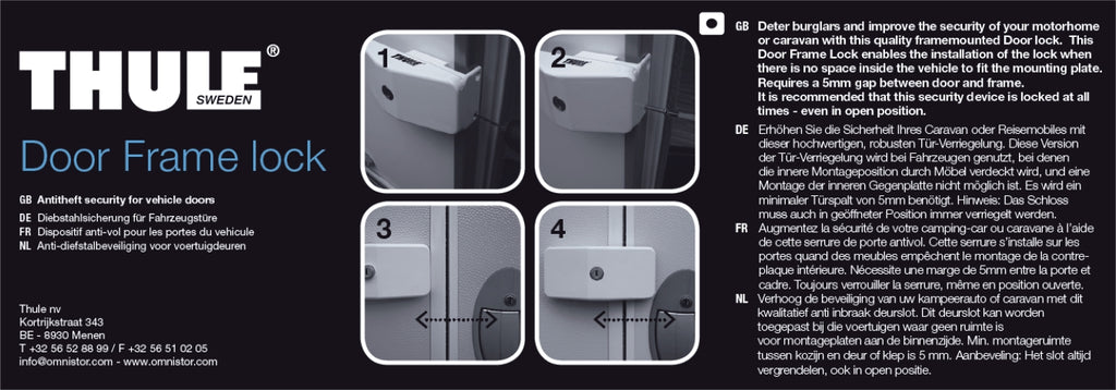 Hochsicherheitsschloss von Thule – von nun an fühlen Sie sich in Ihrem Reisemobil jederzeit sicher aufgehoben. Thule ist eine der führenden Hersteller im Bereich Wohnwagensicherheitstechnik und bringt mit dem „Door Frame Lock“ ein Produkt für den sicherheitsbewussten Camper auf den Markt. Diese Serie von Türverriegelungssystemen ist für Fahrzeuge vorgesehen, bei der die innere Montageposition durch Möbel versperrt wird und somit eine Montage der Gegenplatte eine Herausforderung darstellt. Bitte beachten Sie, dass ein minimaler Türspalt von 5 mm zur erfolgreichen Anbringung vorausgesetzt wird. Des Weiteren bieten die im Lieferumfang enthalten Schlüssel zusätzlichen Schutz durch eine individuelle Schlüssel-Nummer. Somit kann der Schlüssel ohne Vorlage der „Key-Number“ nicht dupliziert werden.