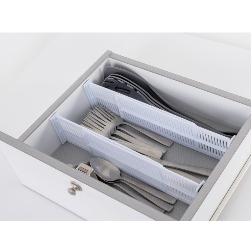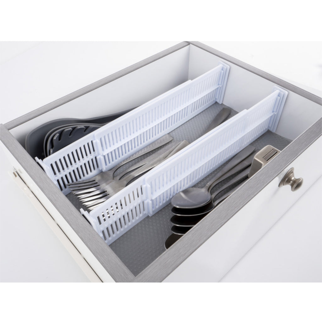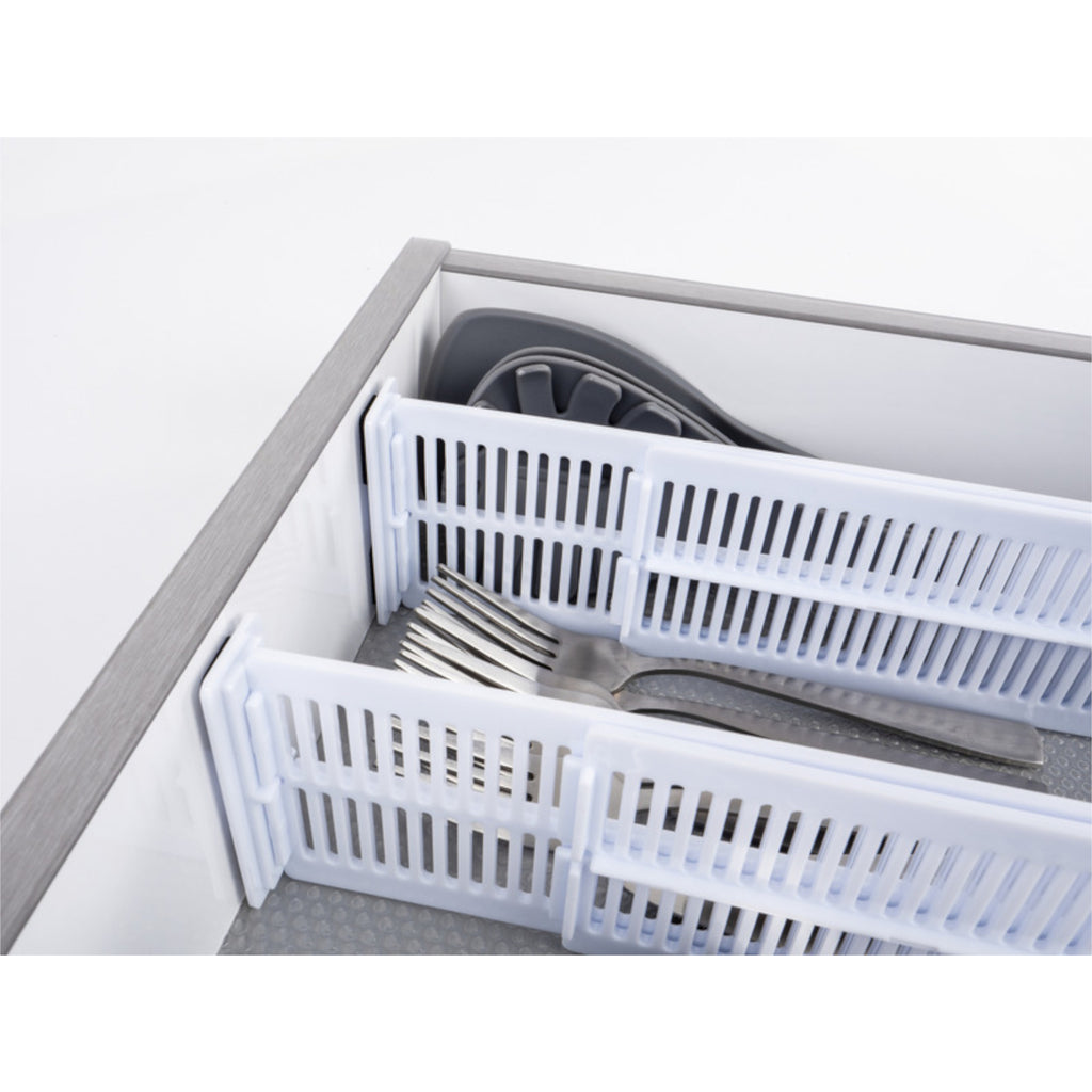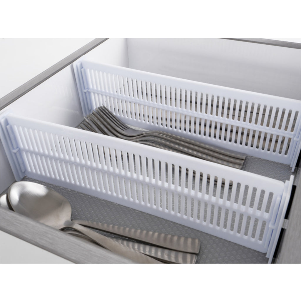 Variable Teilung der Schubladen für flexible Nutzung! 2er Set, bestehend aus 4 Trennwänden, für die Schublade. Jeweils 2 Trennwände werden variabel miteinander durch einklicken verbunden (von 27,5 - 51 cm) und dann per Klebeetikett in die Schublade eingesetzt.