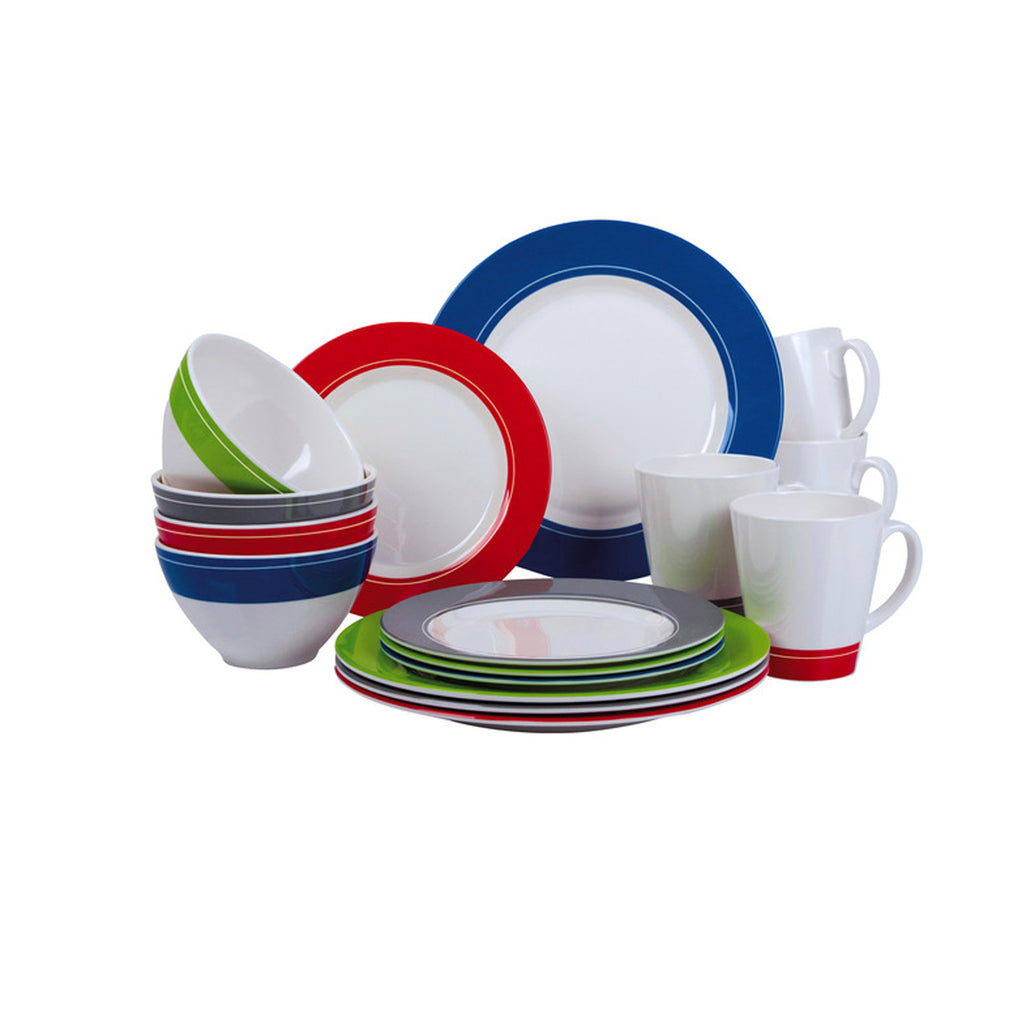 Erleben Sie mit dem Geschirrset frohe Farbenvielfalt auf dem Essenstisch. 16-teiliges lebensmittelechtes Geschirrset für 4 Personen aus 100% Melamin.