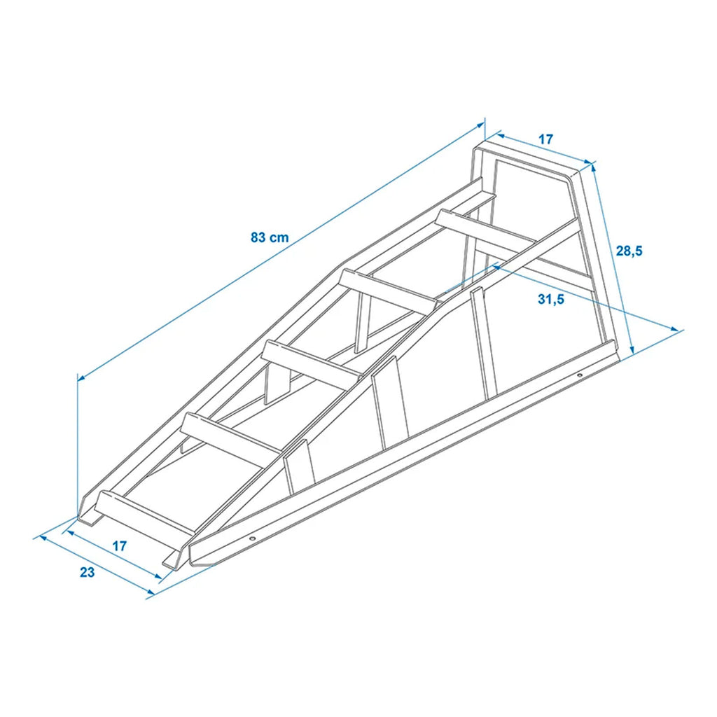 Die Auffahrrampen sind ideal um Reparaturen unter dem Fahrzeug vorzunehmen und können mit den Vorder- oder Hinterreifen befahren werden. Dabei wird das Auto oder der Transporter auf eine Arbeitshöhe von 28,5 cm gebracht. Die maximale Tragkraft beträgt 2000 Kg. Die Auffahrkeile sind für Reifen bis zu einer Breite von 17cm geeignet.