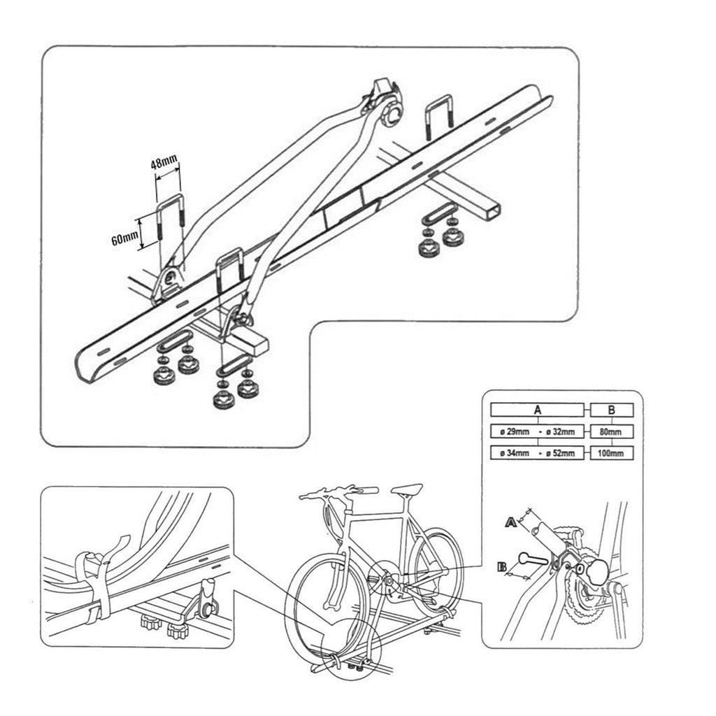 Die Abstände zwischen den Befestigungsbügeln des Dachträgers betragen 60 mm außen und 48 mm innen. Prüfen Sie, ob Ihre Dachträger mit dieser Verschraubung kompatibel sind (siehe Zeichnung).