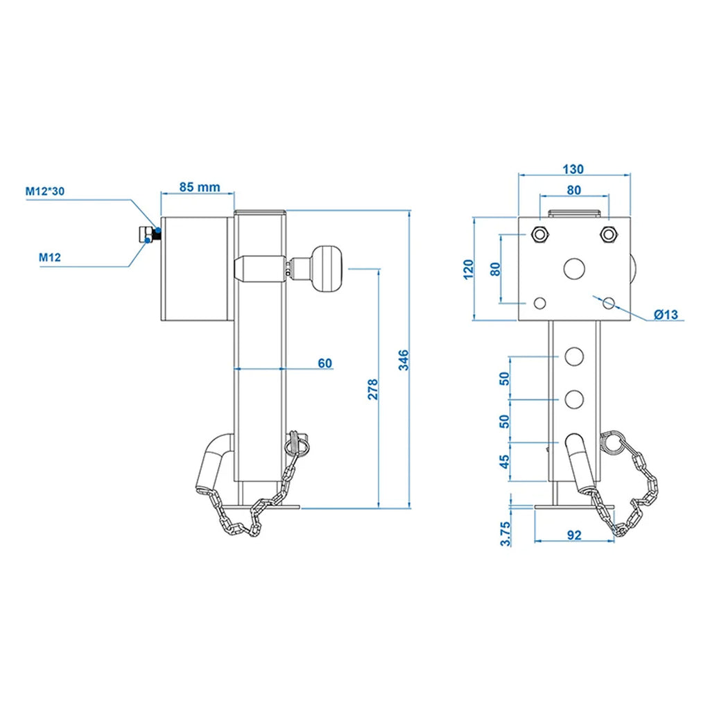 • Befestigung mit 4 M12 Bolzen links oder rechts am Fahrgestell
