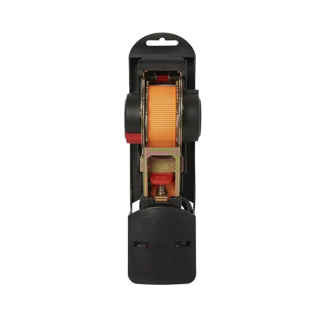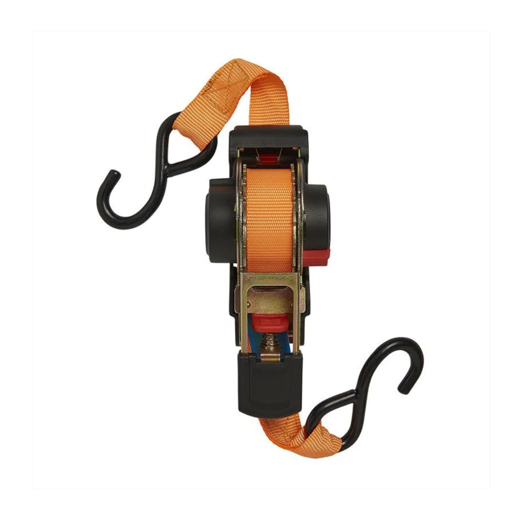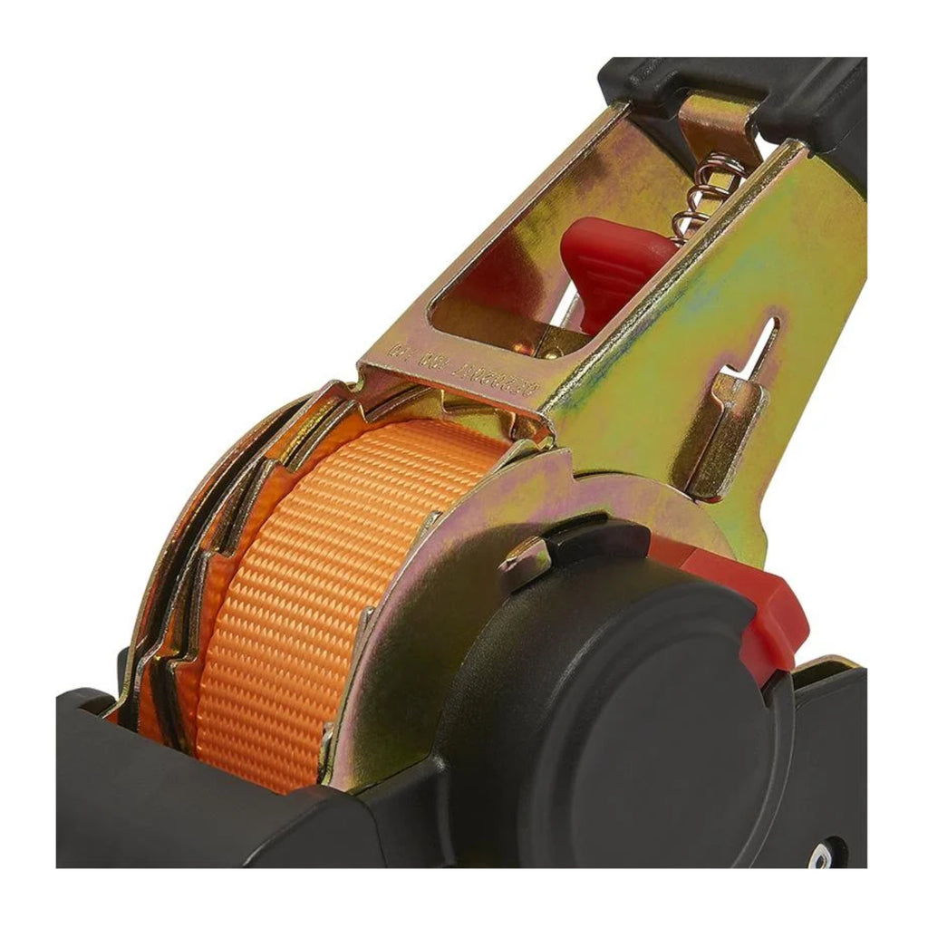 Praktischer Helfer für Unterwegs, mit einer Spannkraft von bis zu 320 Kg. Spanngurt mit Ratsche und Aufrollautomatik. Einfache und leichte Einhebelbedienung mit Entriegelungsknopf. Austattung mit 2 extra starken und beschichteten S-Haken.