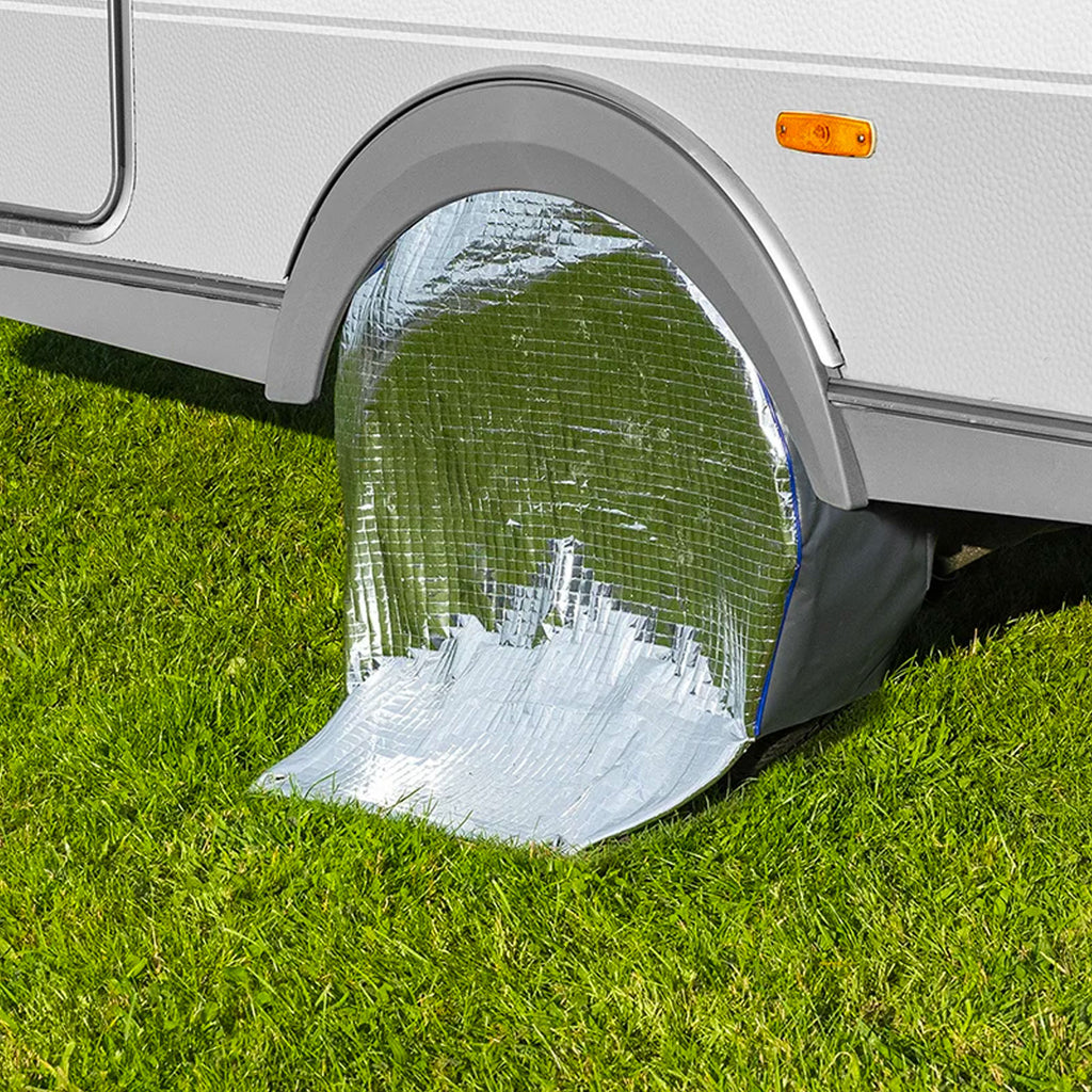 Die sonnenlichtreflektierende Radabdeckung ist der ideale Schutz von Wohnwagen- oder Wohnmobilreifen vor Alterung und Beschädigung durch längere Einwirkung von Sonnen- und UV-Strahlen und ist speziell für Freitzeitfahrzeuge konzipiert.