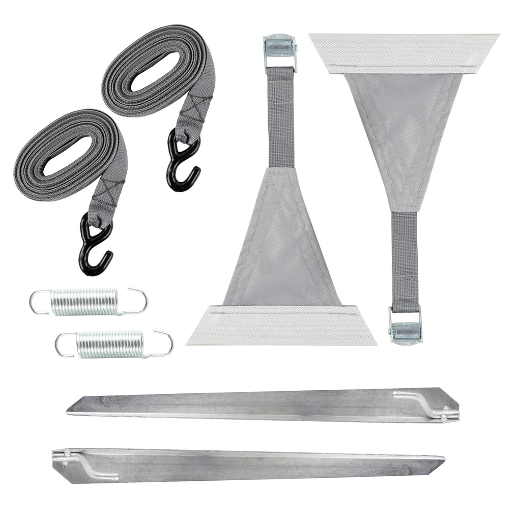 Lieferumfang: 8-teiliges Wamovo Sturm Abspannset bestehend aus: 2x Spannband, 2x Spannfeder, 2x Hering, 2x Adapter ca. ø7,2-7,5 mm