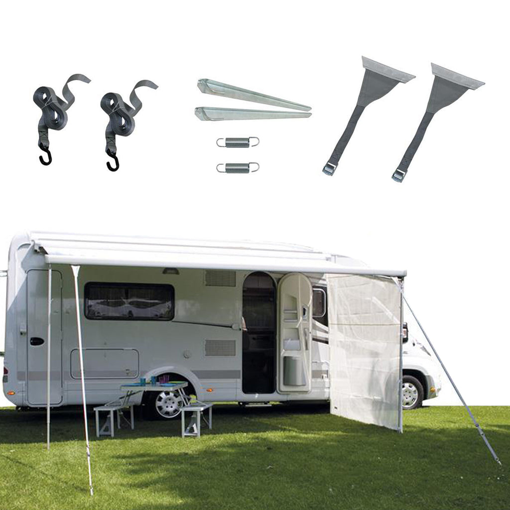 Zur ergänzenden Abspannung von Markisen, Kasettenmarkisen und Sackmarkisen bei schlechtem Wetter. Die perfekte Sturmsicherung für deine Markise am Wohnwagen oder Wohnmobil - Durch die sichere Befestigung der Markise, werden eventuelle Sturmschäden verhindert oder begrenzt.