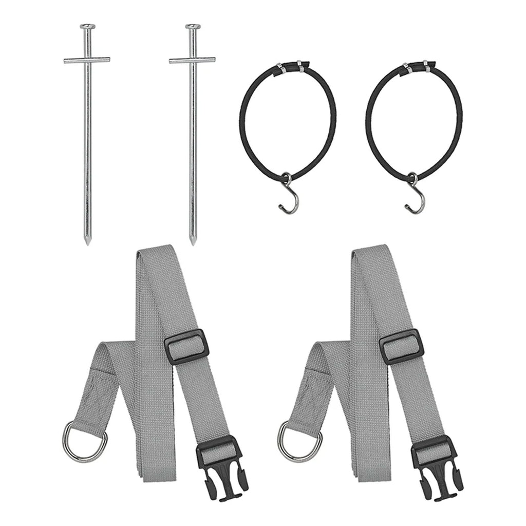 Das Abspannset eignet sich ideal zum Sichern von Wohnwagen und Wohnmobilmarkise in windigen Bedingungen und hält auch das Vorzelt bei schlechtem Wetter fest an seinem Platz.