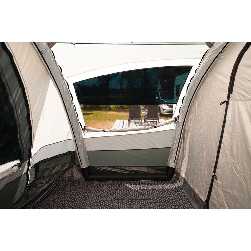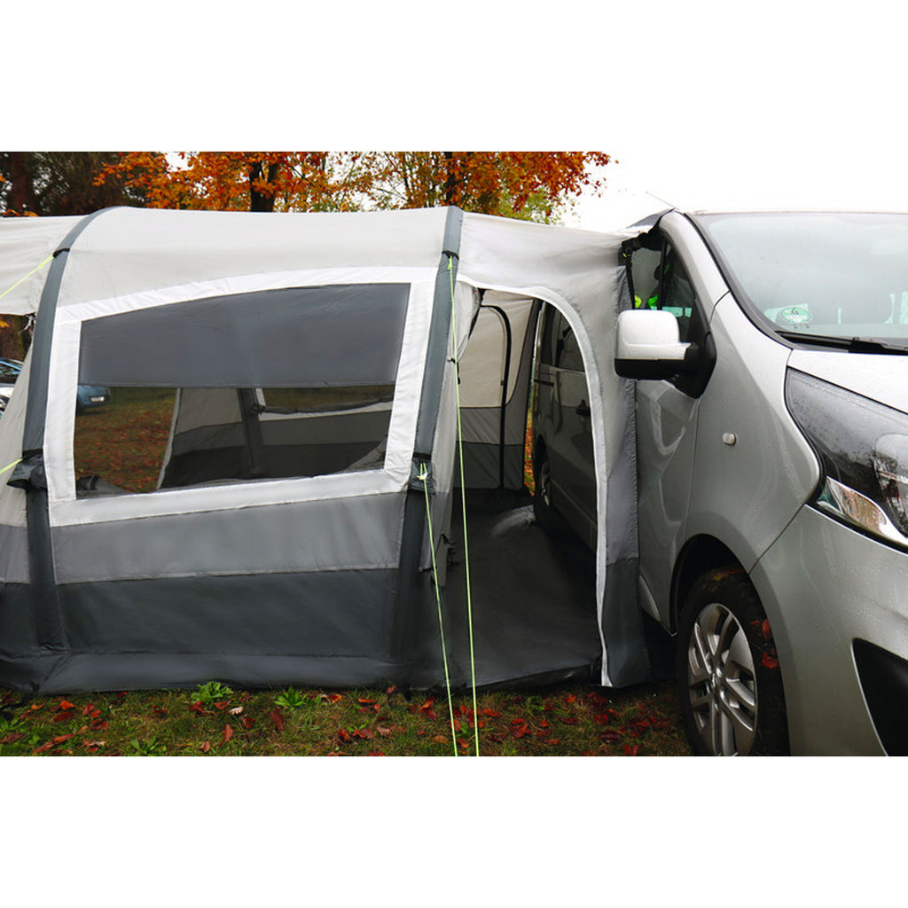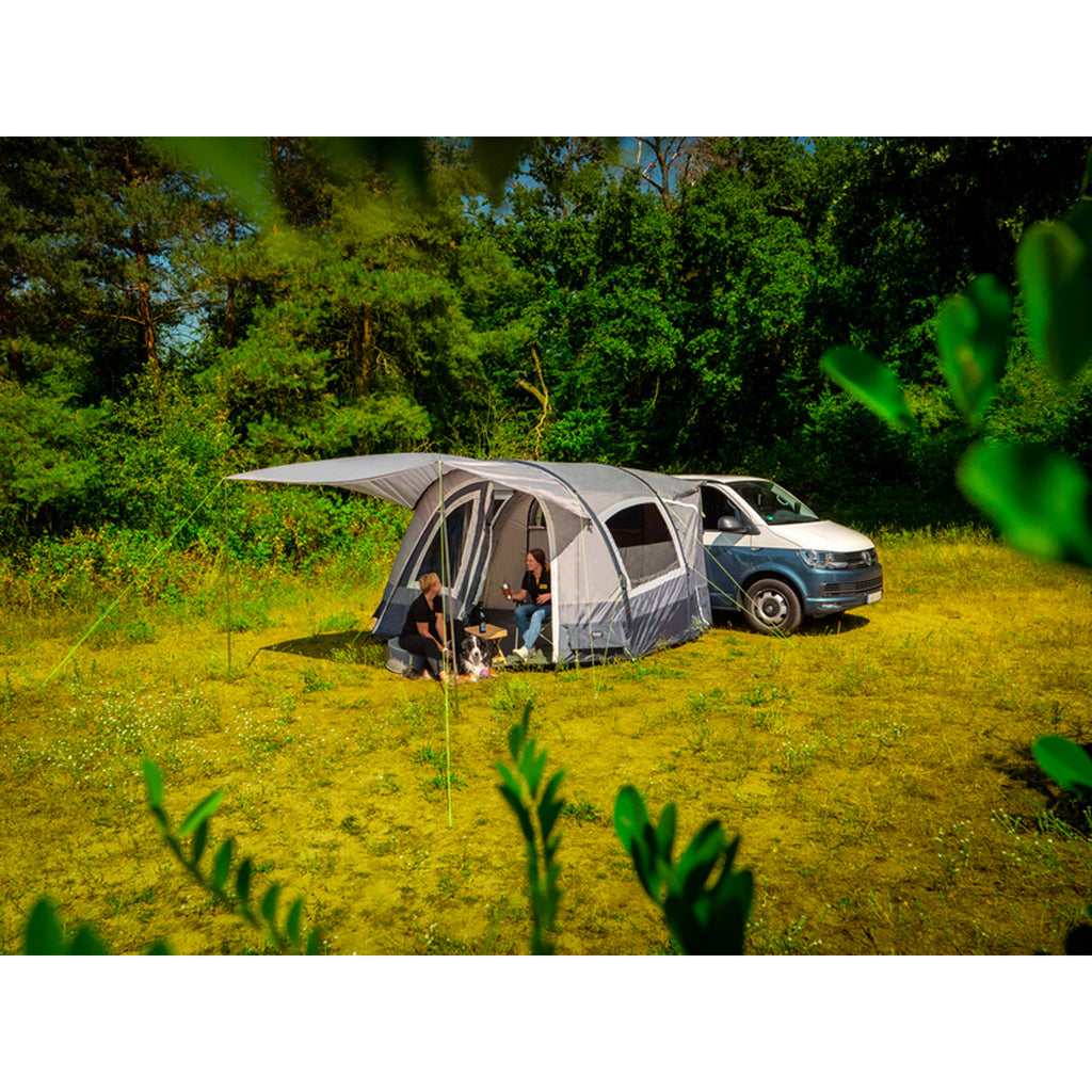 Das Busvorzelt mit allen Vorzügen, ob Alleinstehend oder mit Schleusenanbindung. Der Aufbau ist mit nur einem Luftschlauch zum aufpumpen schnell und einfach gemacht. Das Buszelt bietet dir ausreichend Privatsphäre auf dem Campingplatz oder in der Natur. Ein wahres Raumwunder: Das Anbauzelt bietet dir viel nutzbaren Platz mit Stehhöhe und das direkt am Fahrzeug. Der erweiterte Wohnraum lädt zum Essen, Spielen, Entspannen oder Schlafen ein. Die große Tür kann als Veranda genutzt werden oder komplett geöffnet werden. Ein großes abnehmbares Sonnensegel über der Front bietet zusätzlichen Komfort und Schatten. Die Rückwand, mit Moskitonetz für gute Belüftung, kann links oder rechts geöffnet werden. Ausgestattet ist das Zelt zudem mit getönten Fenstern, Zeltboden und einer 90cm Schleuse mit Tür auf jeder Seite. 3 zusätzliche Dachstangen geben Halt.