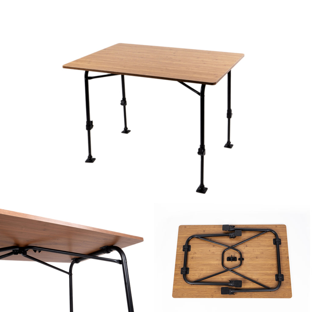 Der neue leichte Camp4 TJÖRN 80 punktet mit einer wetterfesten Tischplatte im Bambus-Dekor. Die großen Tellerfüße verhindern das Einsinken und sorgen für einen stabilen Stand. Die matt-schwarz lackierten Tischbeine sind mit einem Handgriff stufenlos höhenverstellbar von 51-71 cm. Der Tisch ist mit 50 kg überdurchschnittlich belastbar und bietet Platz für 2 - 4 Personen.