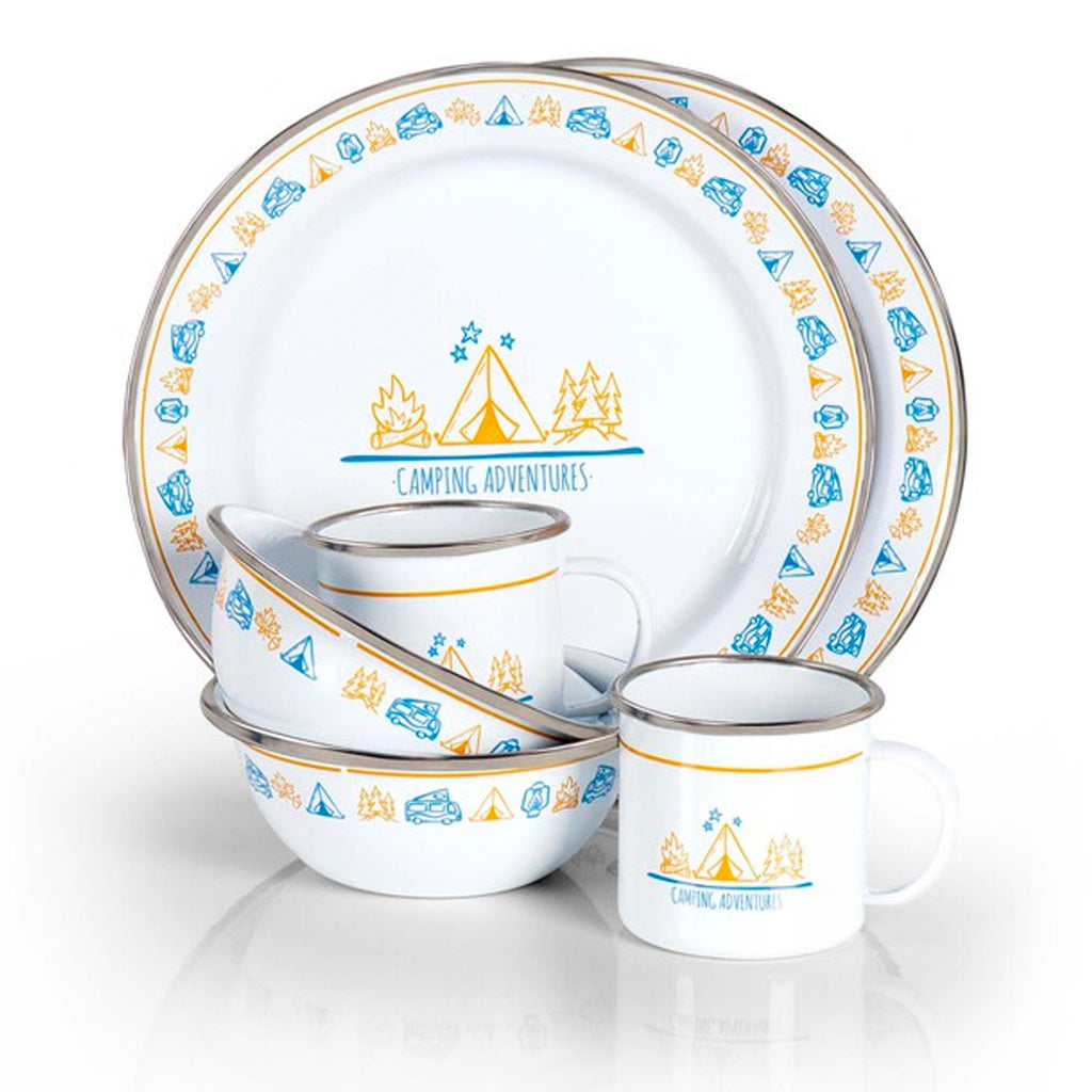 Bruchsicheres Emaille Geschirr-Set. Mit kultigem Design, welches zu Abenteuern einlädt. Das Geschirr ist schön leicht und kann darum gut zum Picknicken, Grillen, Campen oder Zelten mitgenommen werden!