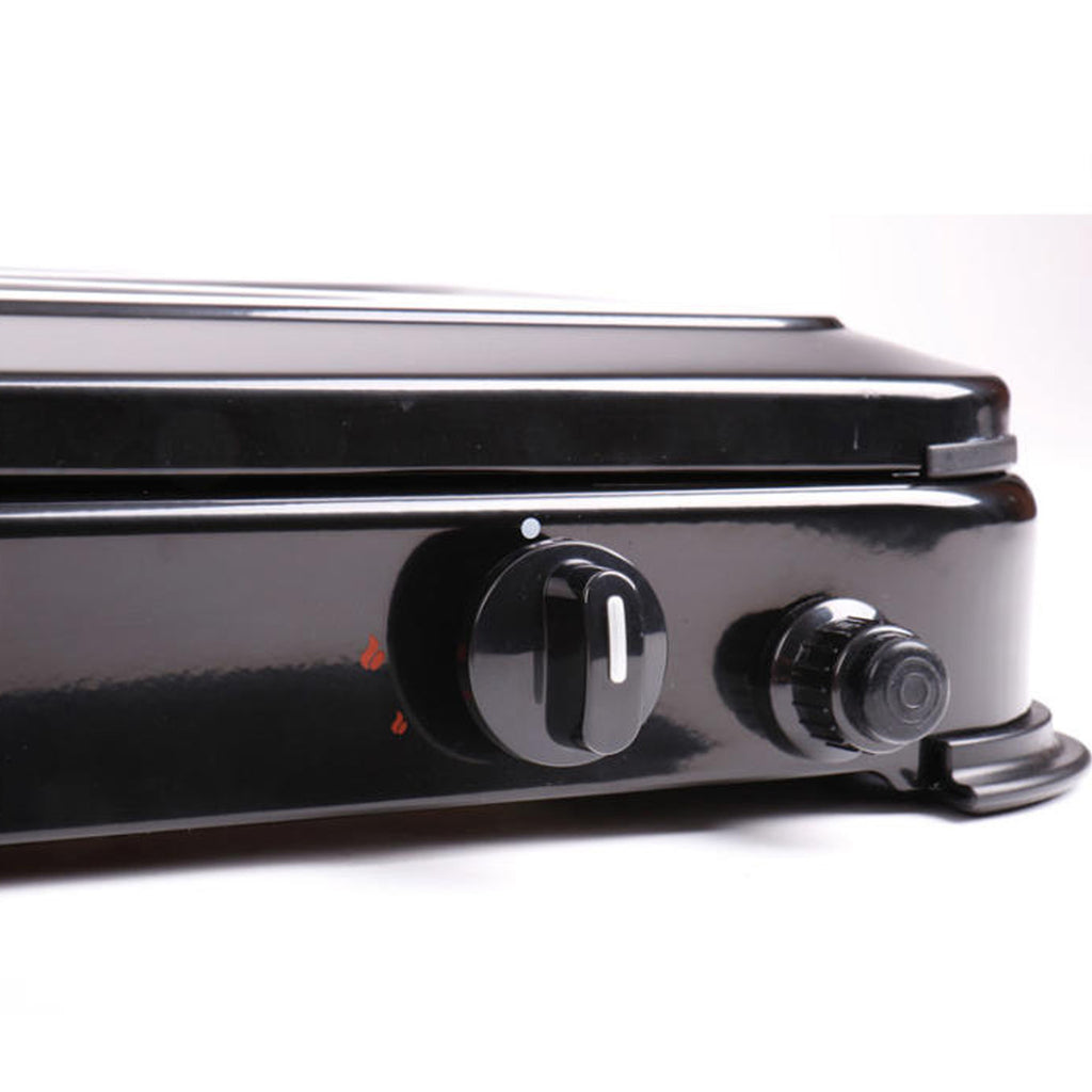 Formschöner, schwarzer Gaskocher der Luxusklasse. Brennergröße 2x 10 cm, Wärmezufuhr 2x 2,2 kW. Mit Zündsicherung und Piezo-Zündung.